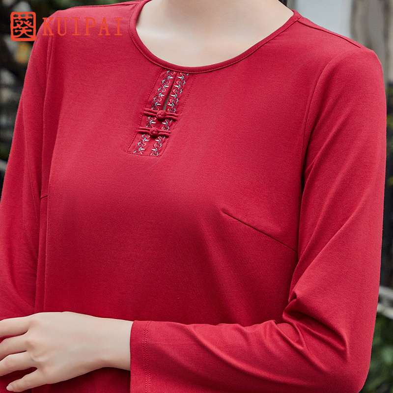 葵秋民族风宽松长袖T恤微弹透气棉中老年妈妈装打底绣花针织衫