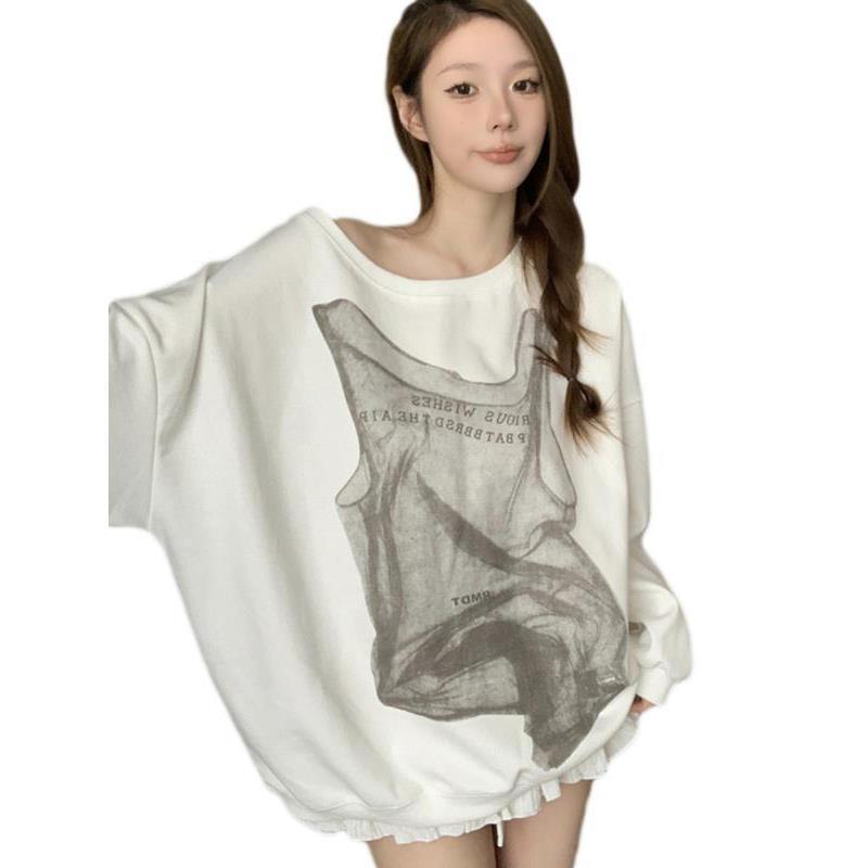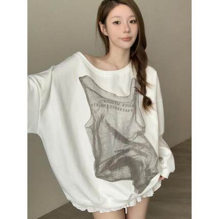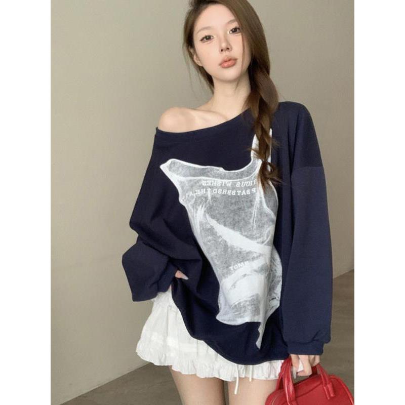 韩系春秋季宽松慵懒风斜肩印花长袖卫衣女百搭休闲中长款辣妹上衣