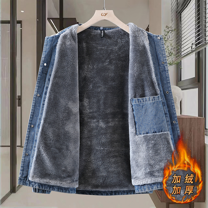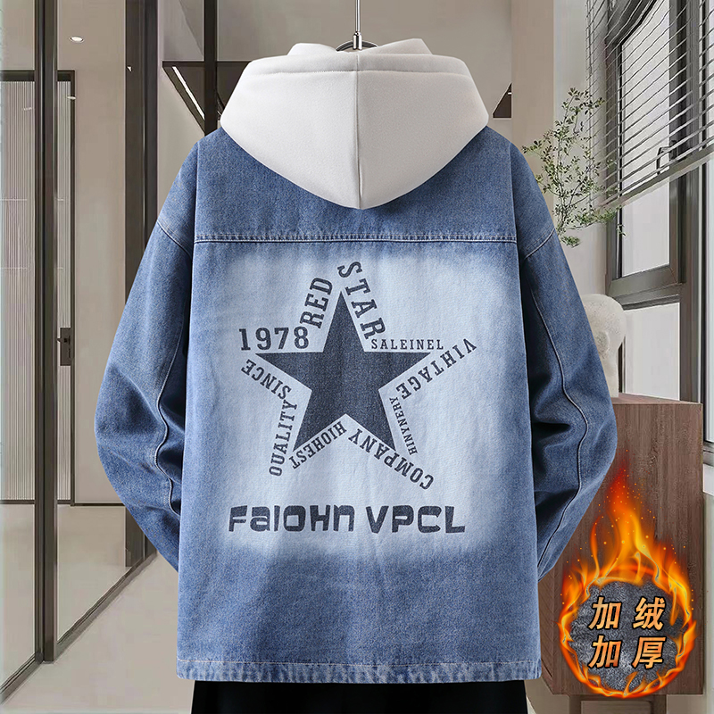 水洗牛仔夹克男秋冬款潮流百搭加绒加厚外套男青少年学生宽松棉衣