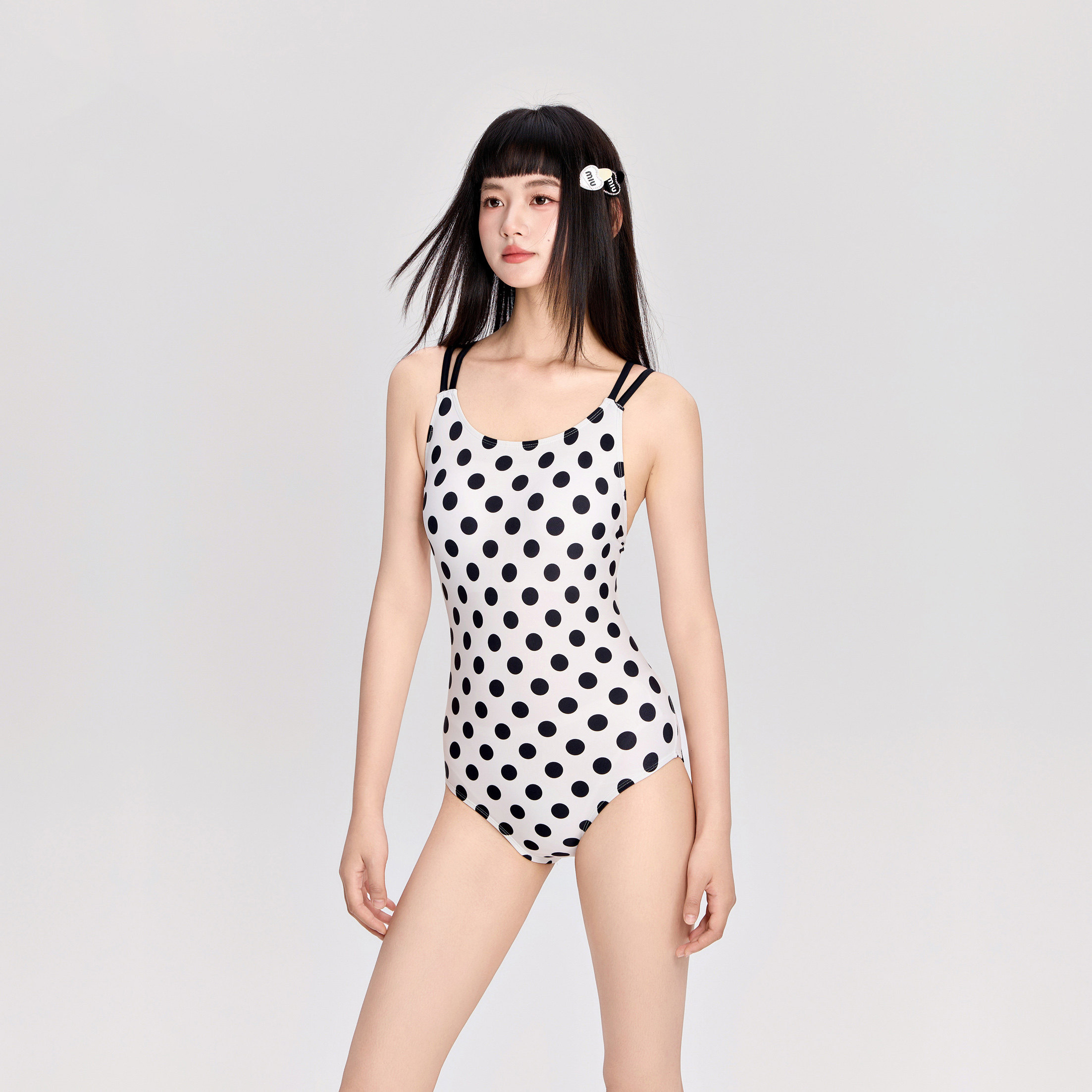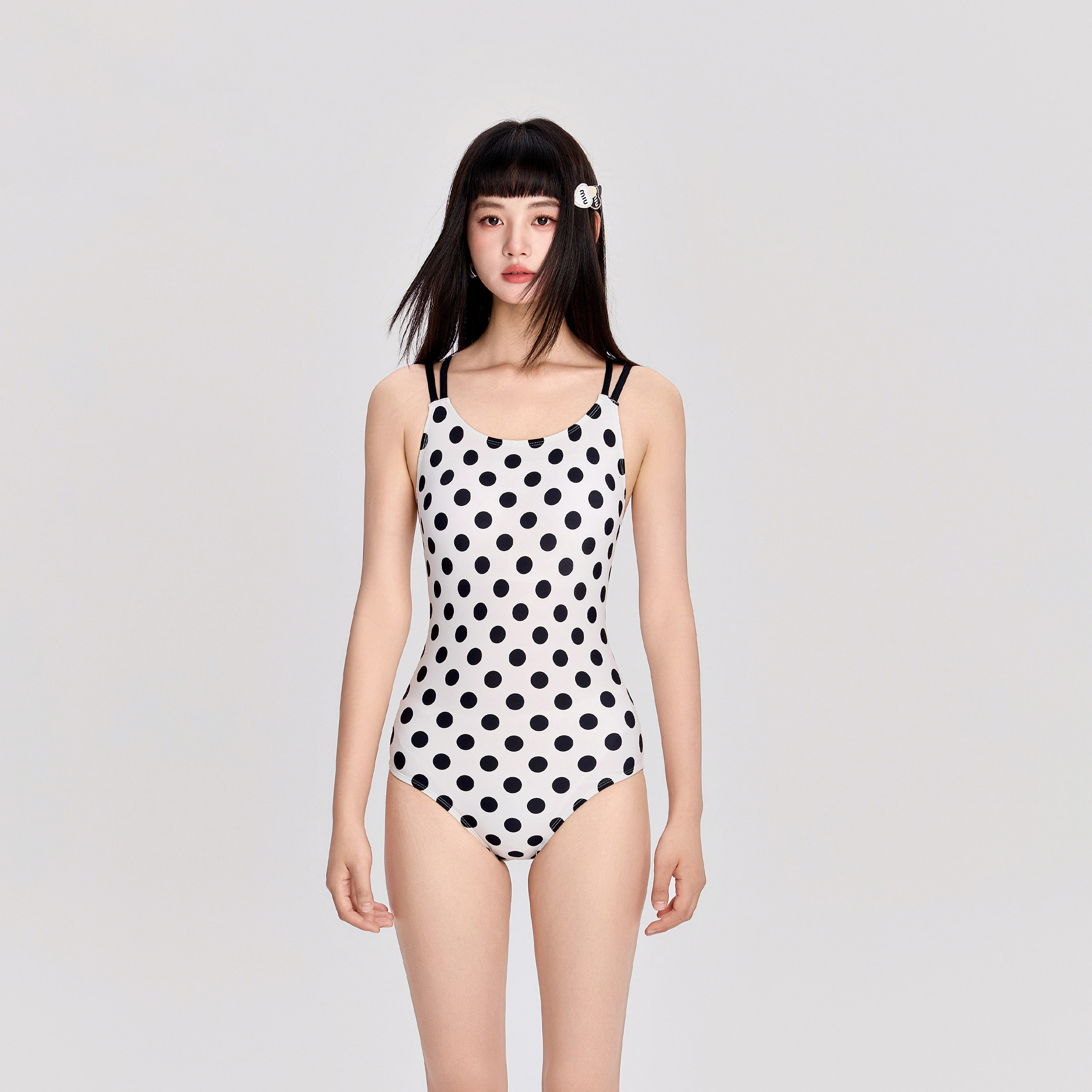 新款黑白波点连体三角专业竞速游泳衣女高级感海边度假温泉泳装