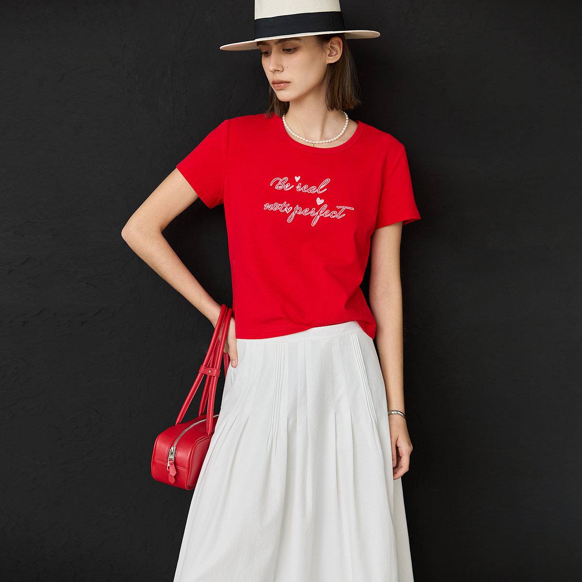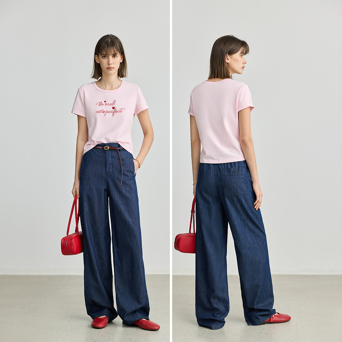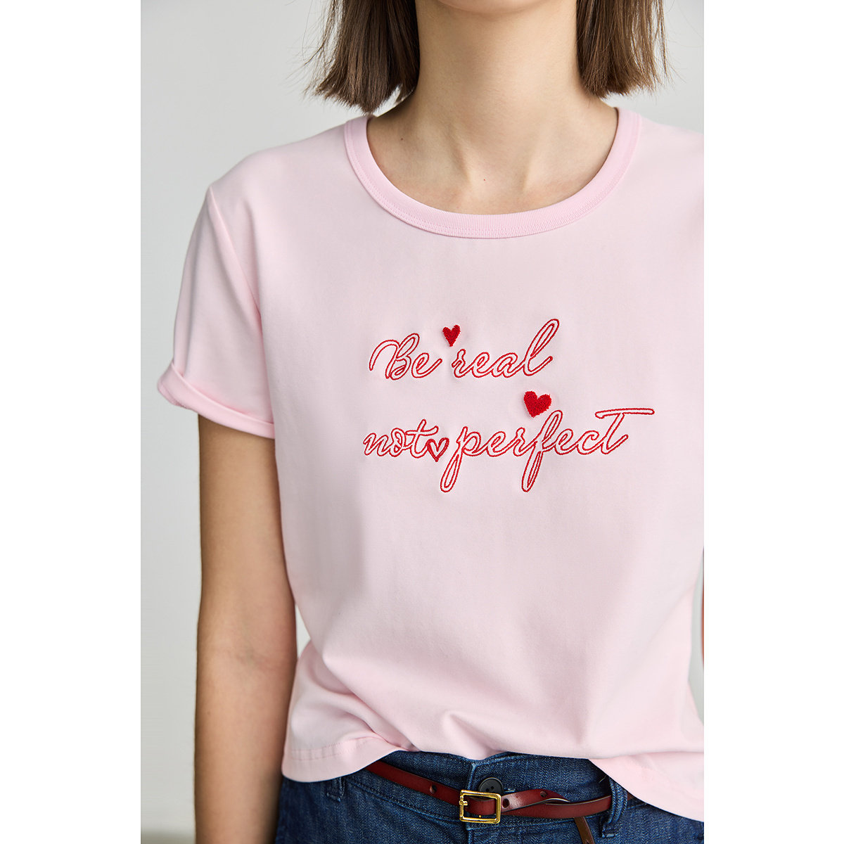 LILY25春新款多巴胺独特立体撞色绣花修身通勤圆领T恤女短袖上衣