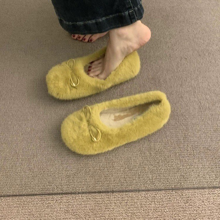 2025新款秋冬毛毛鞋蝴蝶结平底保暖棉鞋女外穿百搭舒适一脚蹬单鞋