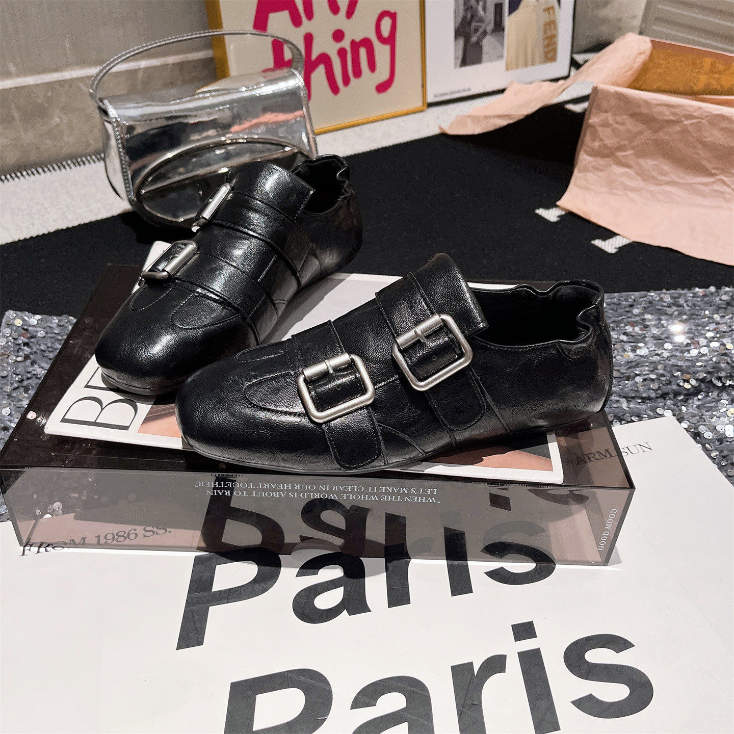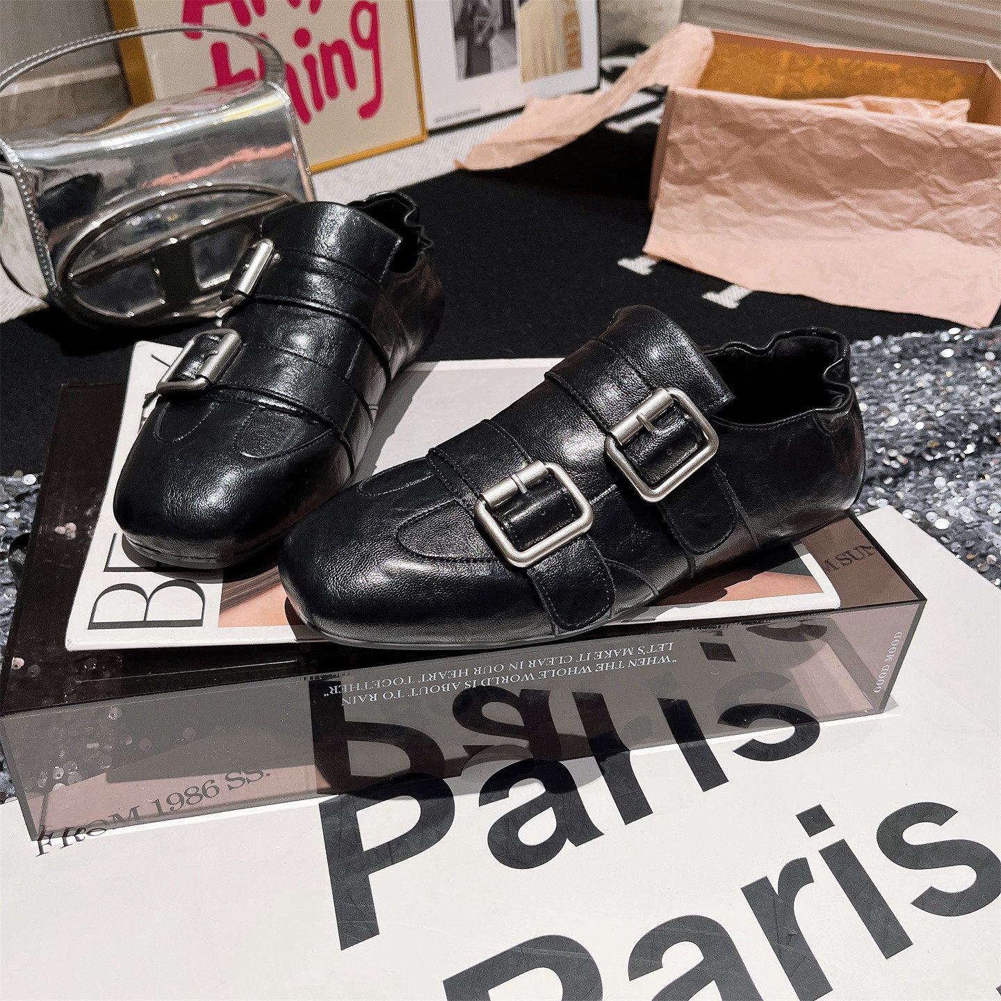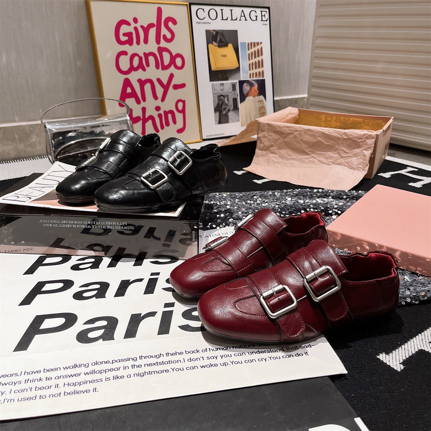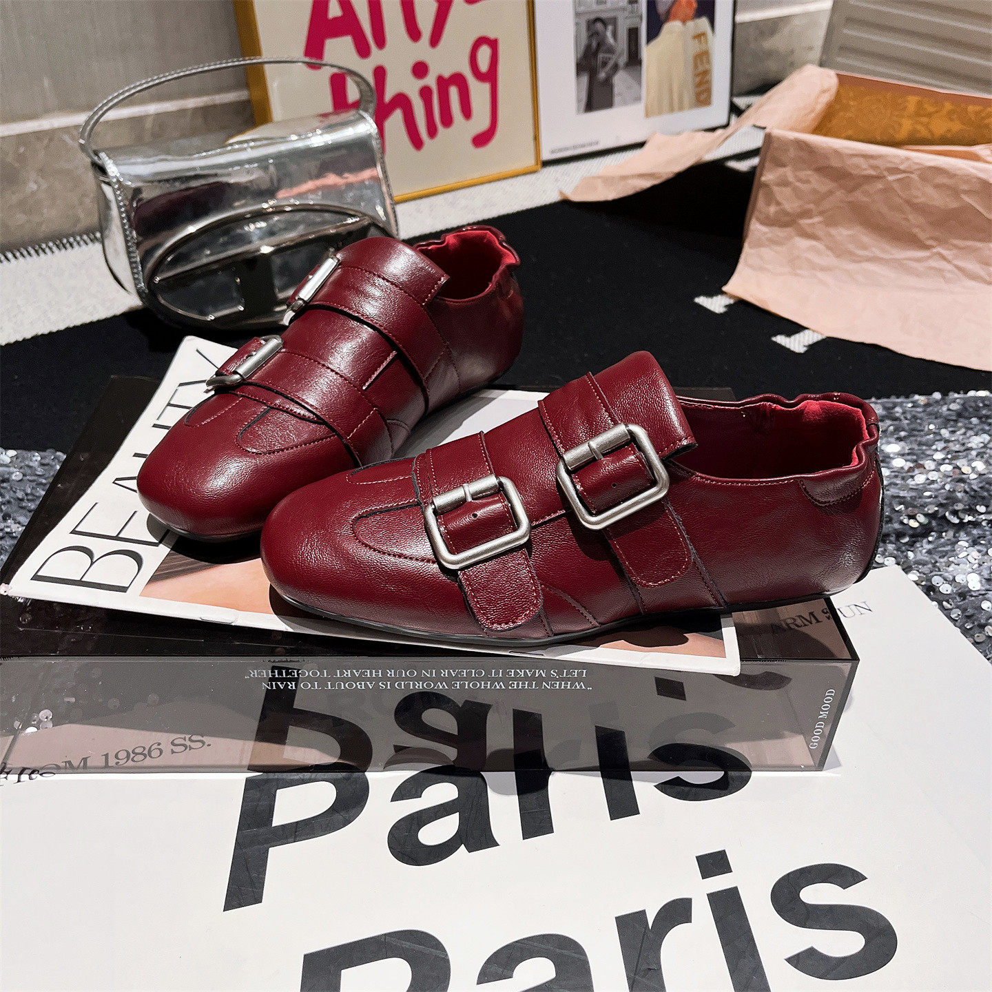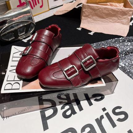 软皮版~欧货新款金属扣软底平底布洛克豆豆鞋单鞋酒红一脚蹬女鞋