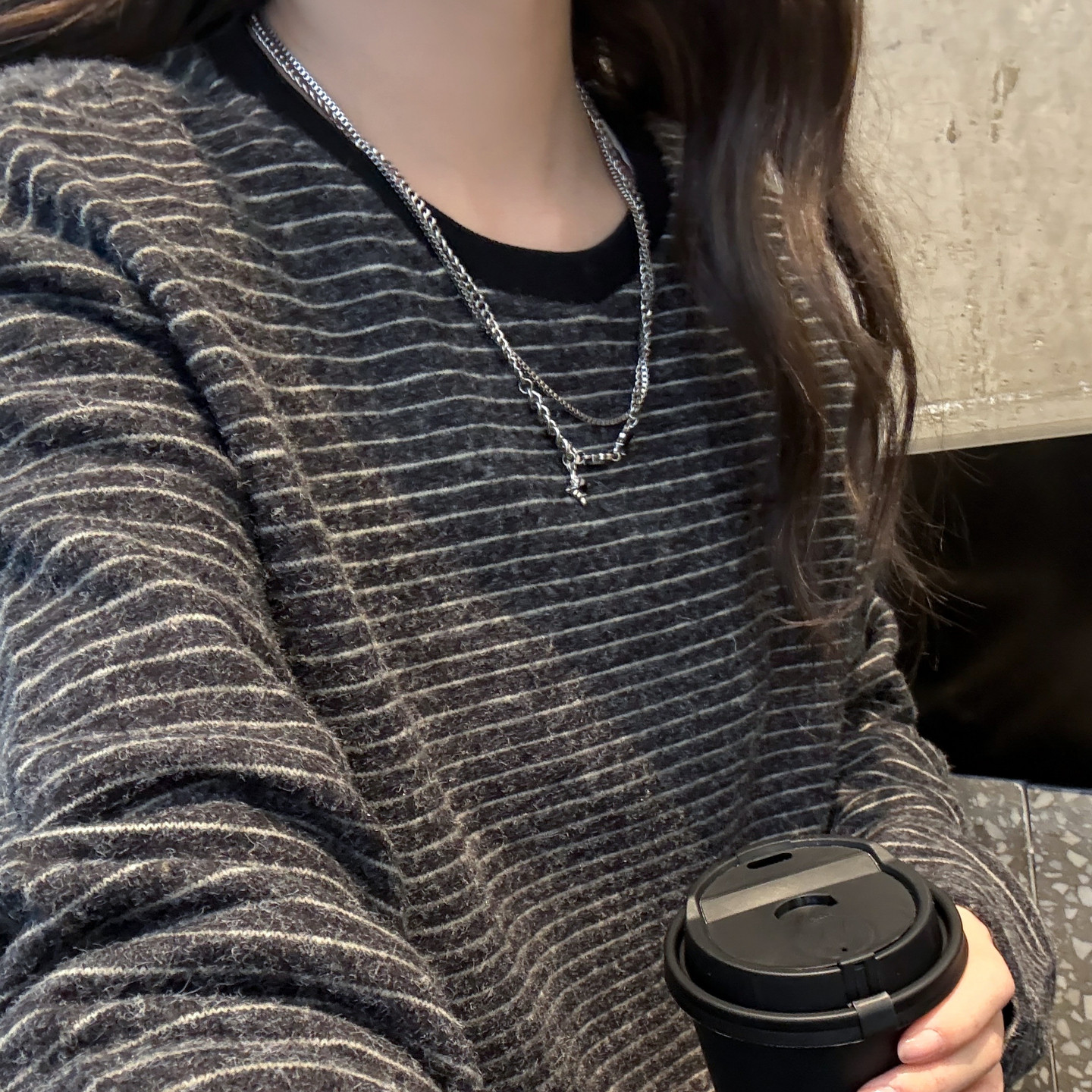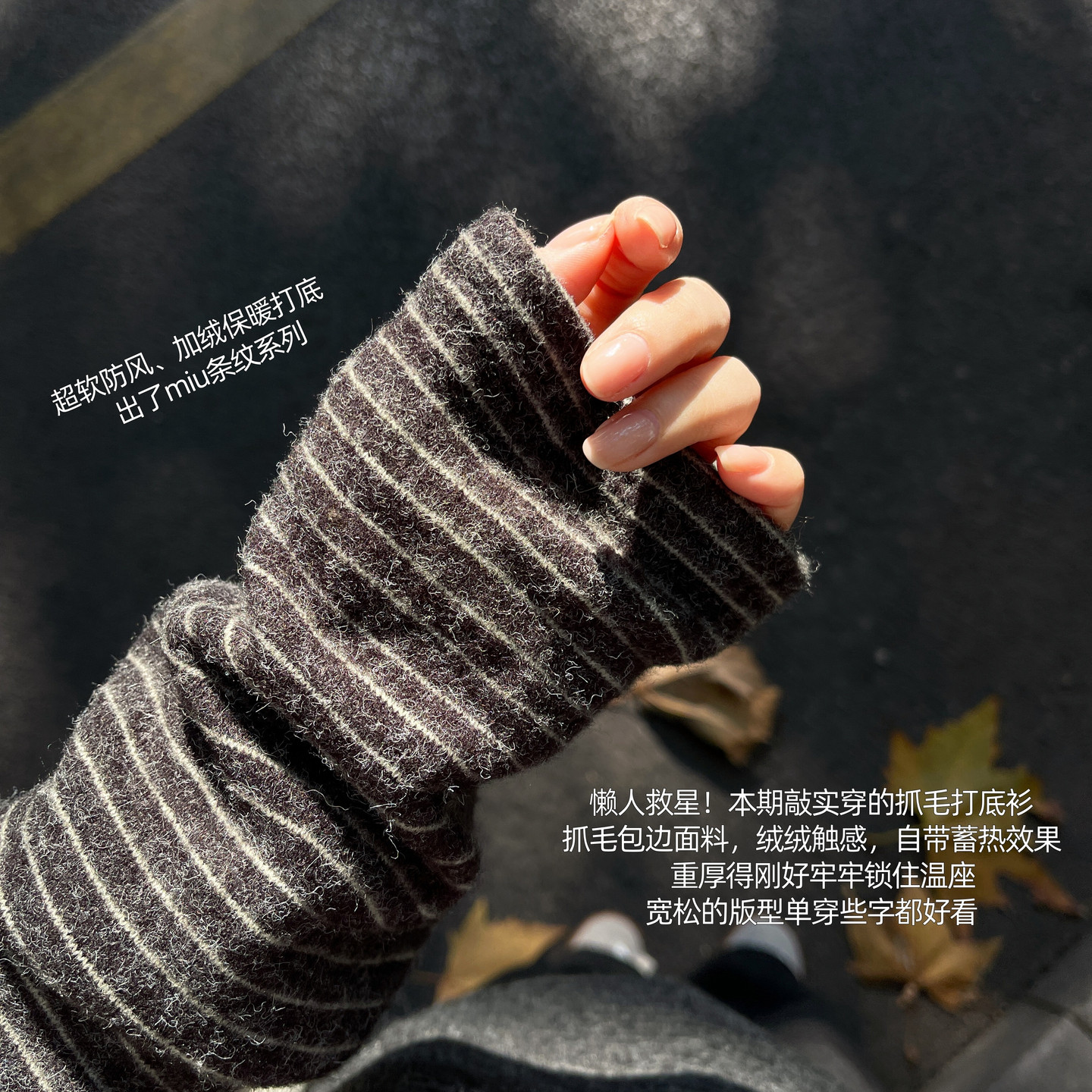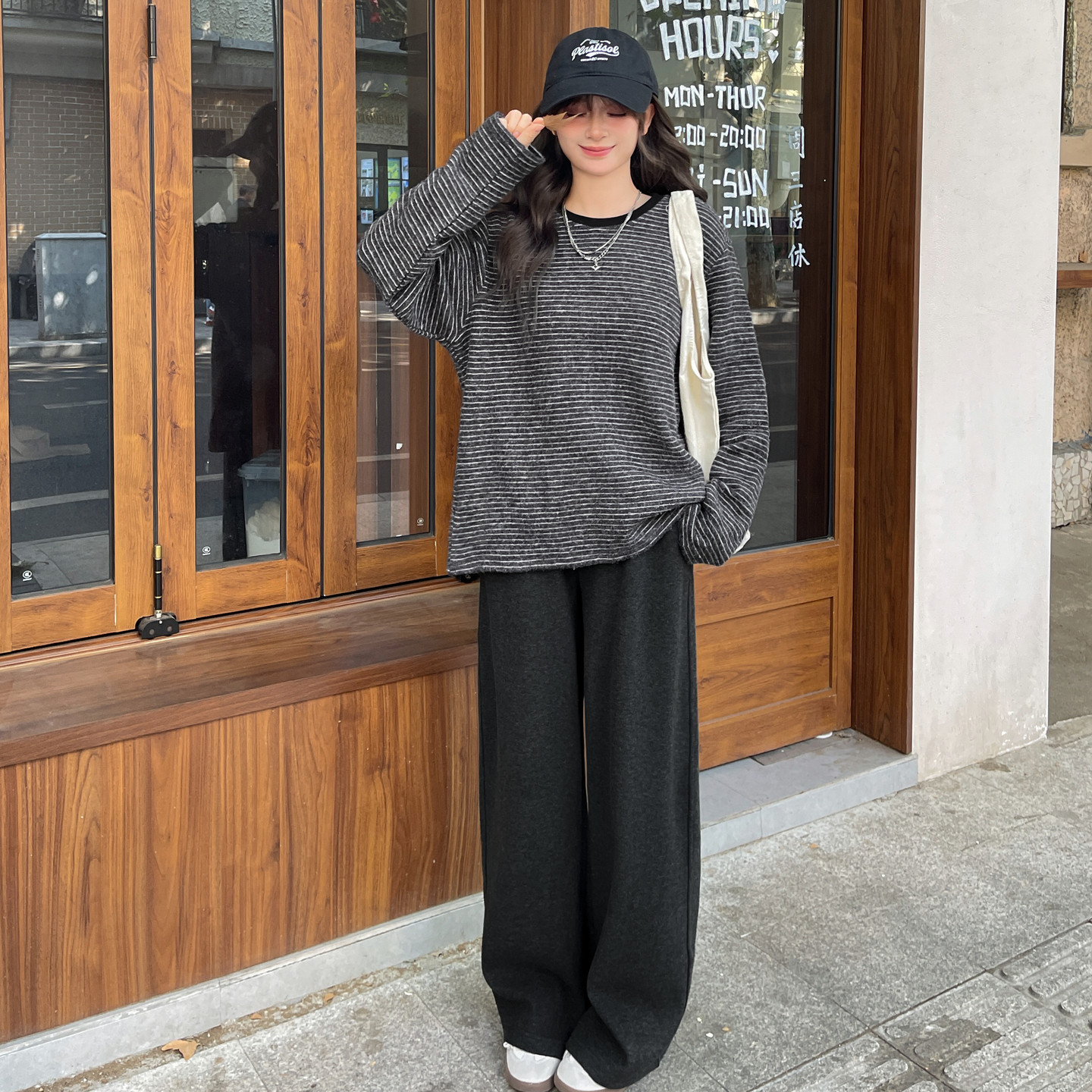 森女部落休闲百搭长袖T恤女2025新款中性条纹宽松显瘦圆领上衣冬