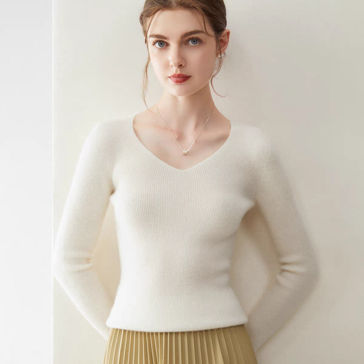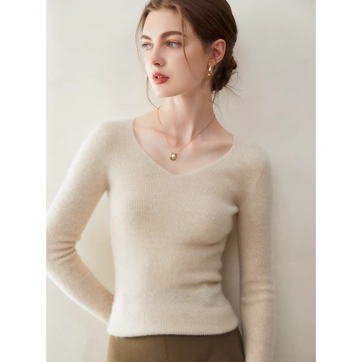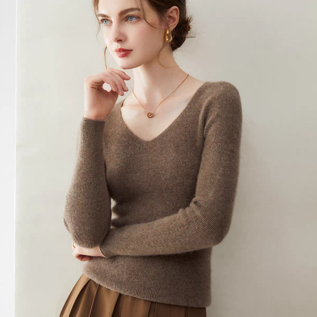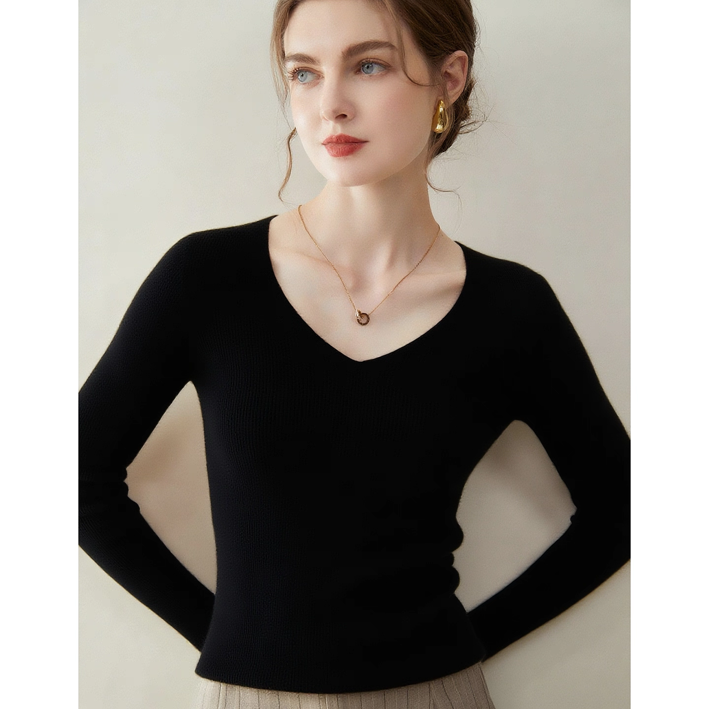 鄂尔多斯市无缝一体可机洗V领羊毛衫女修身显瘦针织羊绒打底衫女