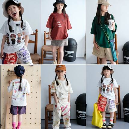 小七baby夏季新款拼色字母短袖牛仔涂鸦短裤套装男女童宝宝HW05