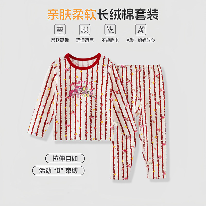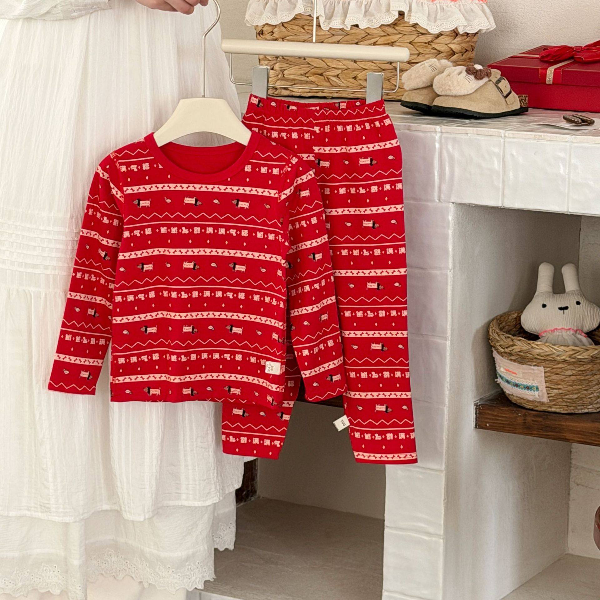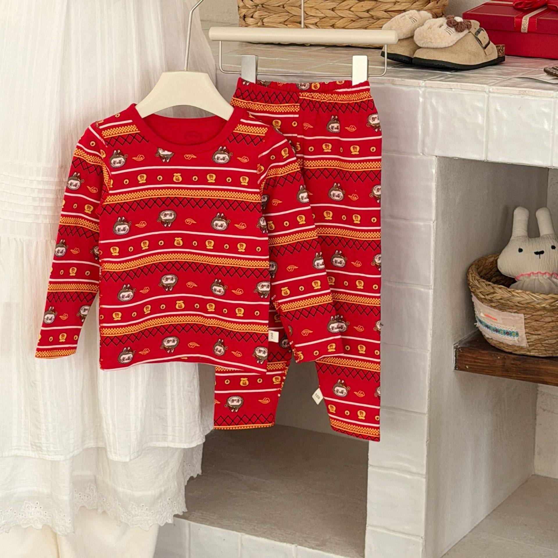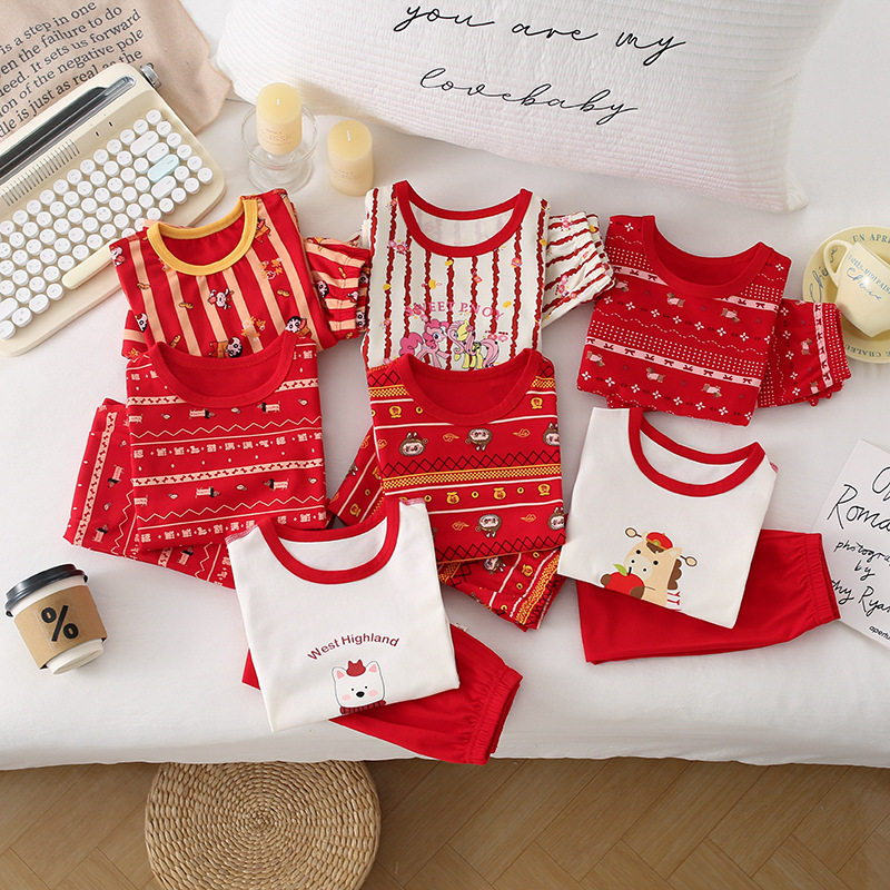 儿童纯棉本命年秋衣秋裤内衣套装男女大童红色马年保暖打底杉睡衣