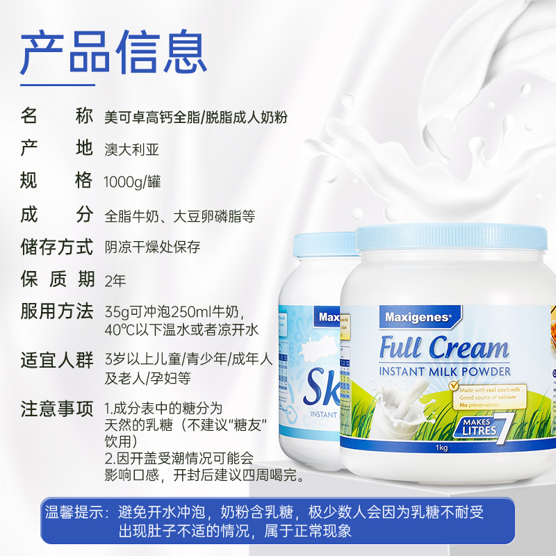 Maxigenes美可卓蓝妹子脱脂牛奶粉1kg女士减脂健身营养补钙蓝胖子