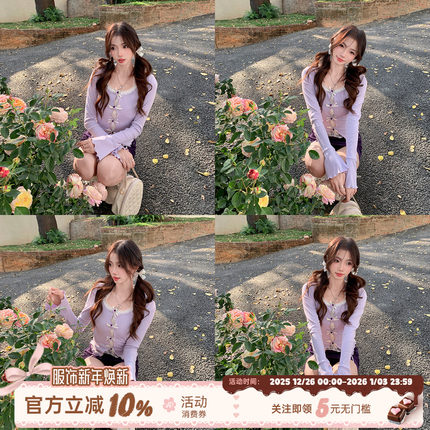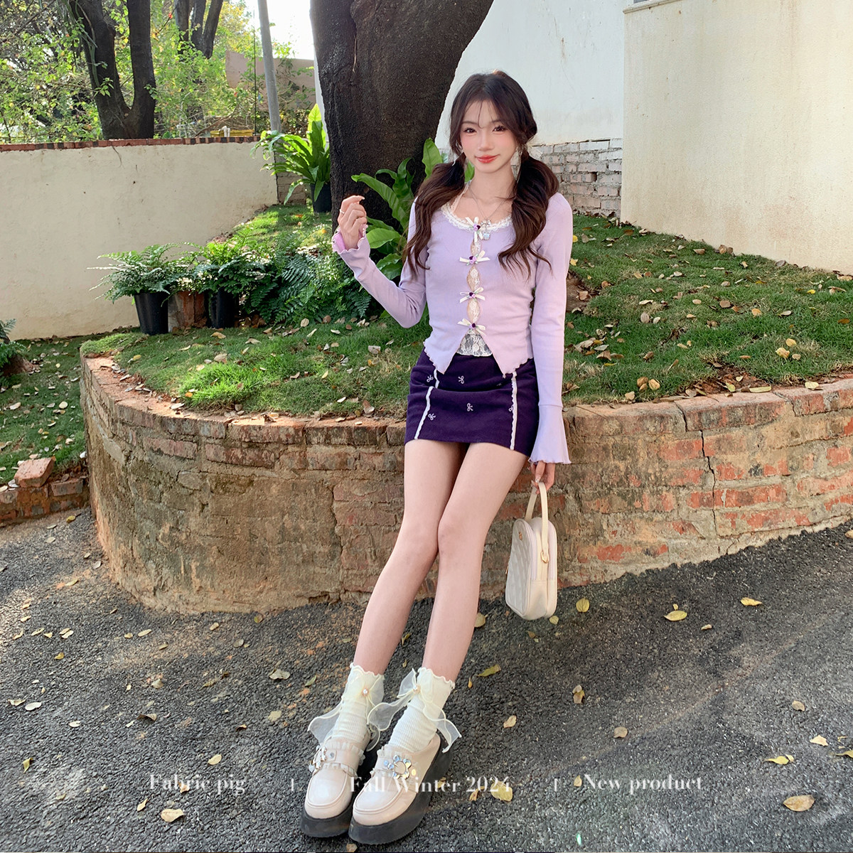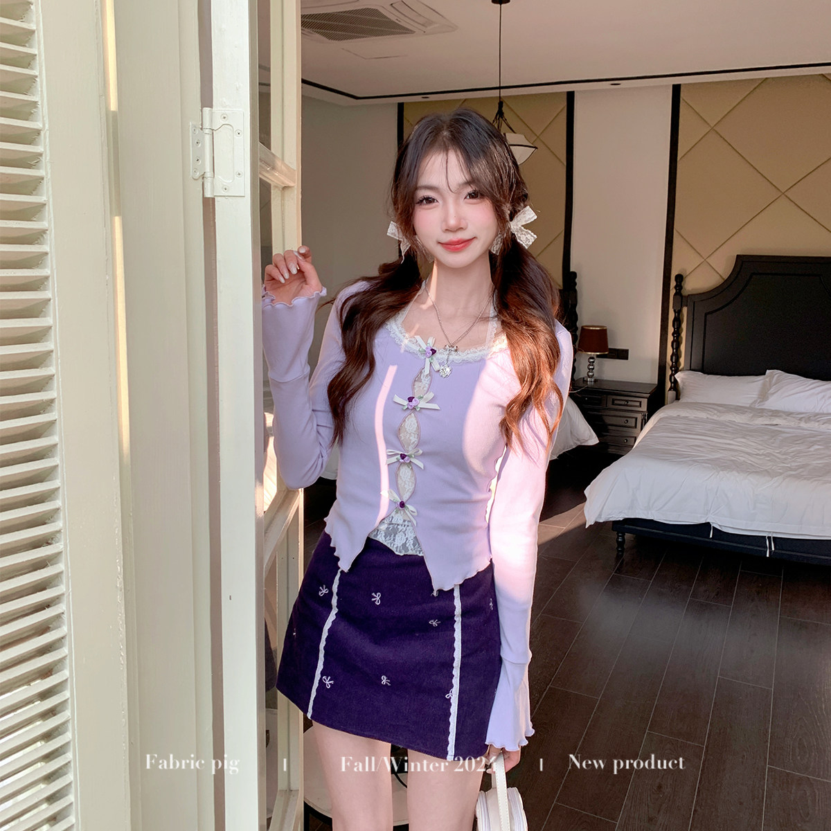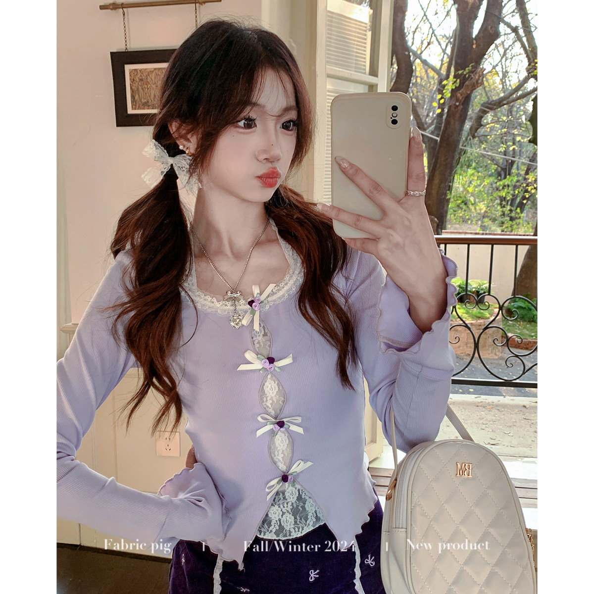 织物猪 紫藤之恋 蕾丝花边假两件上衣女秋季紫色长袖针织打底衫
