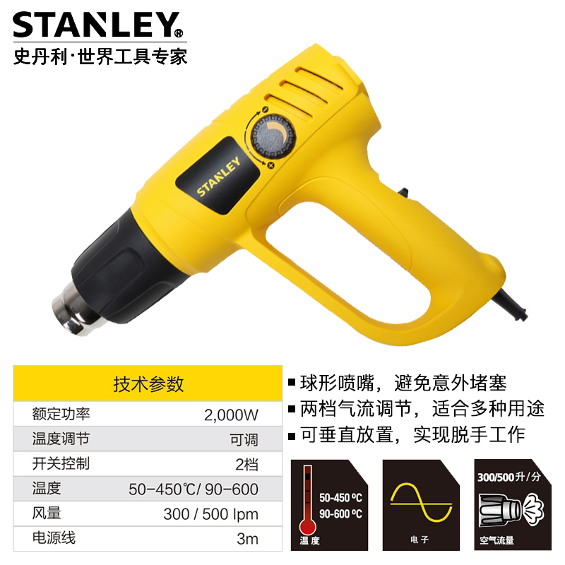 史丹利2000W可调温热风枪汽车贴膜工业热吹风机薄膜热缩STXH2000
