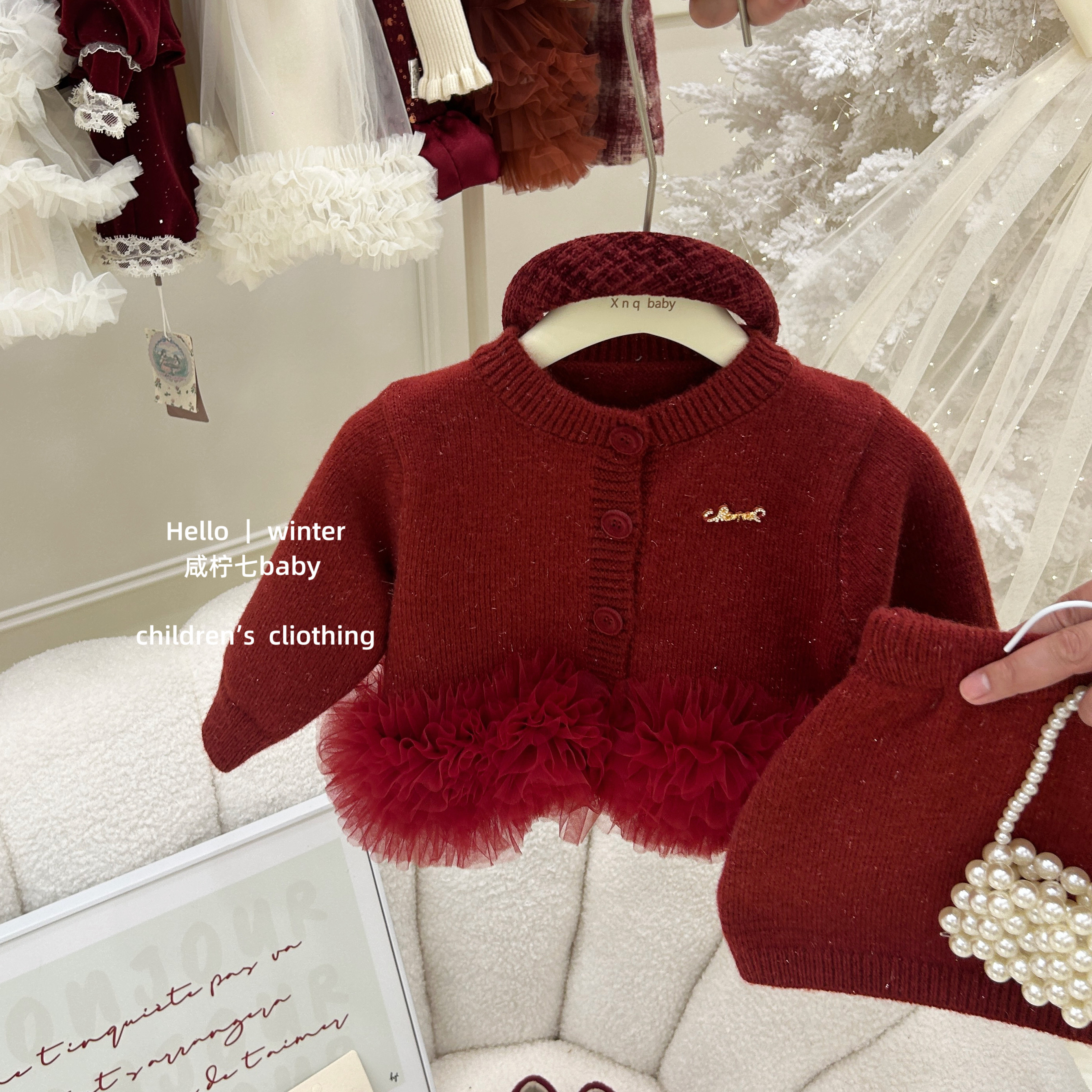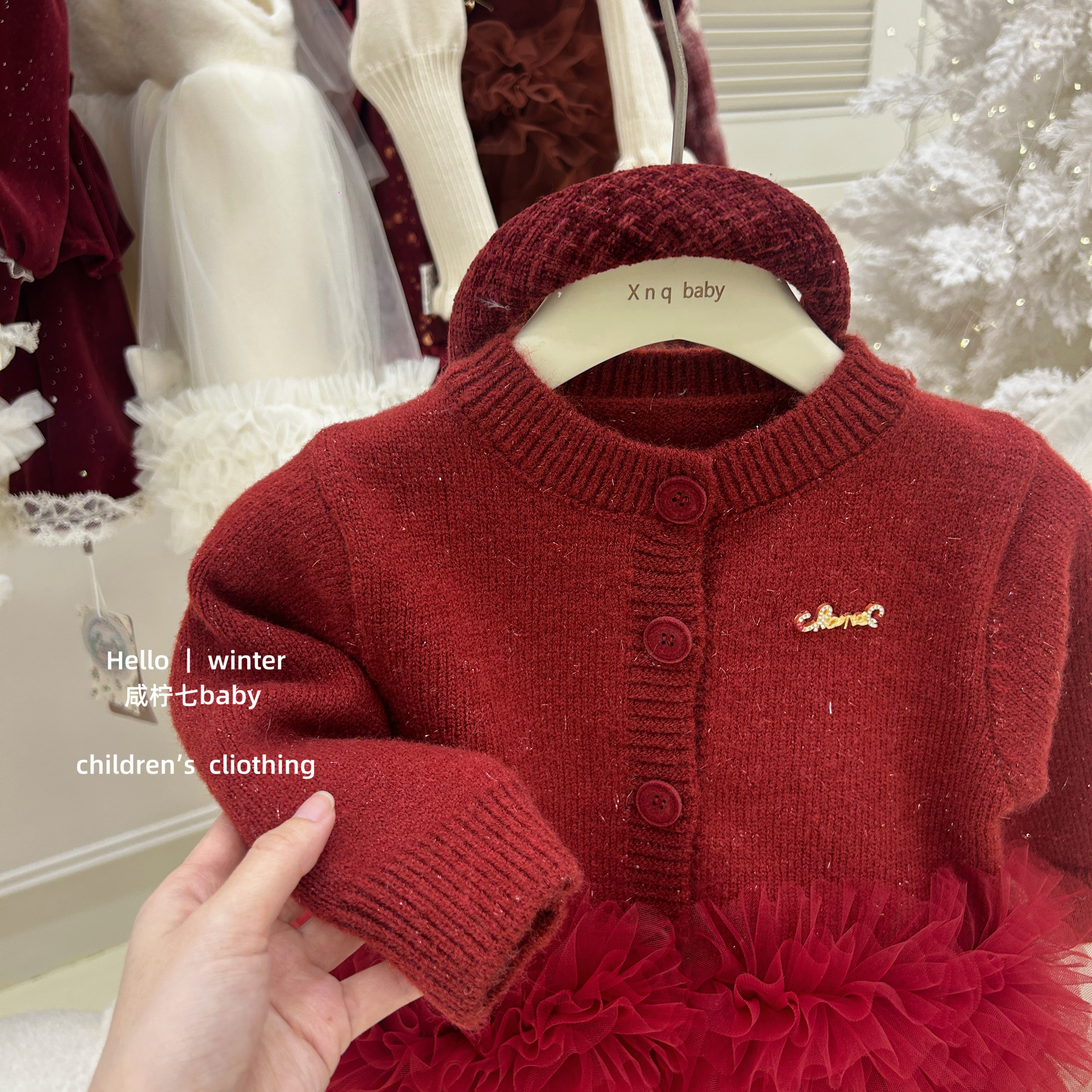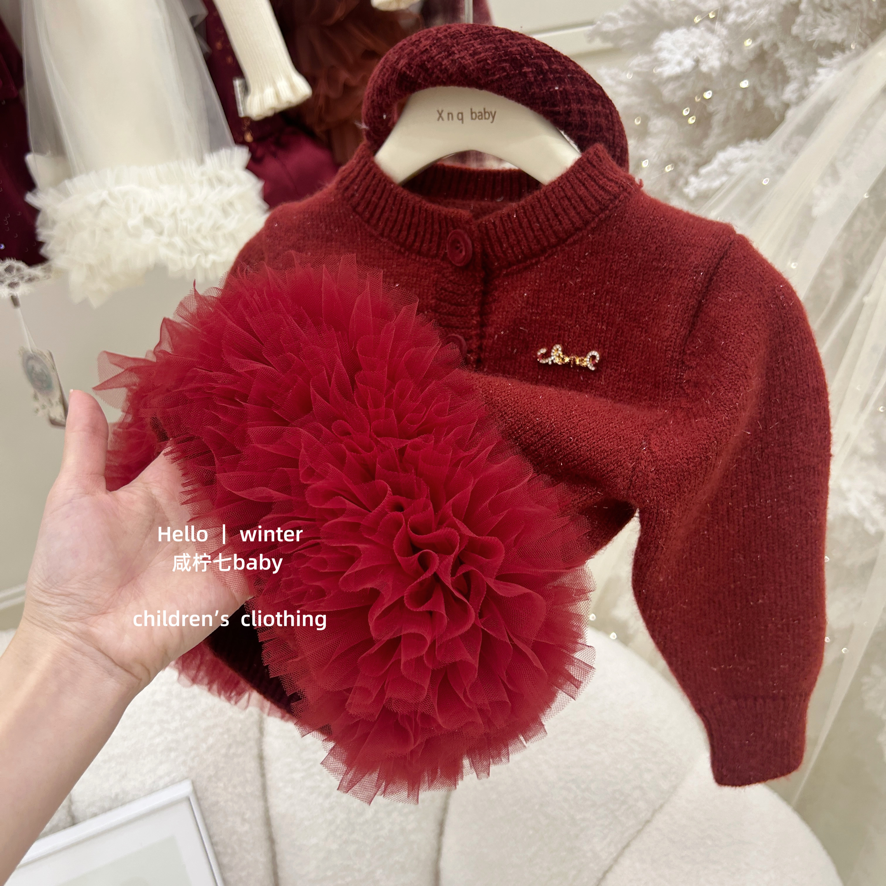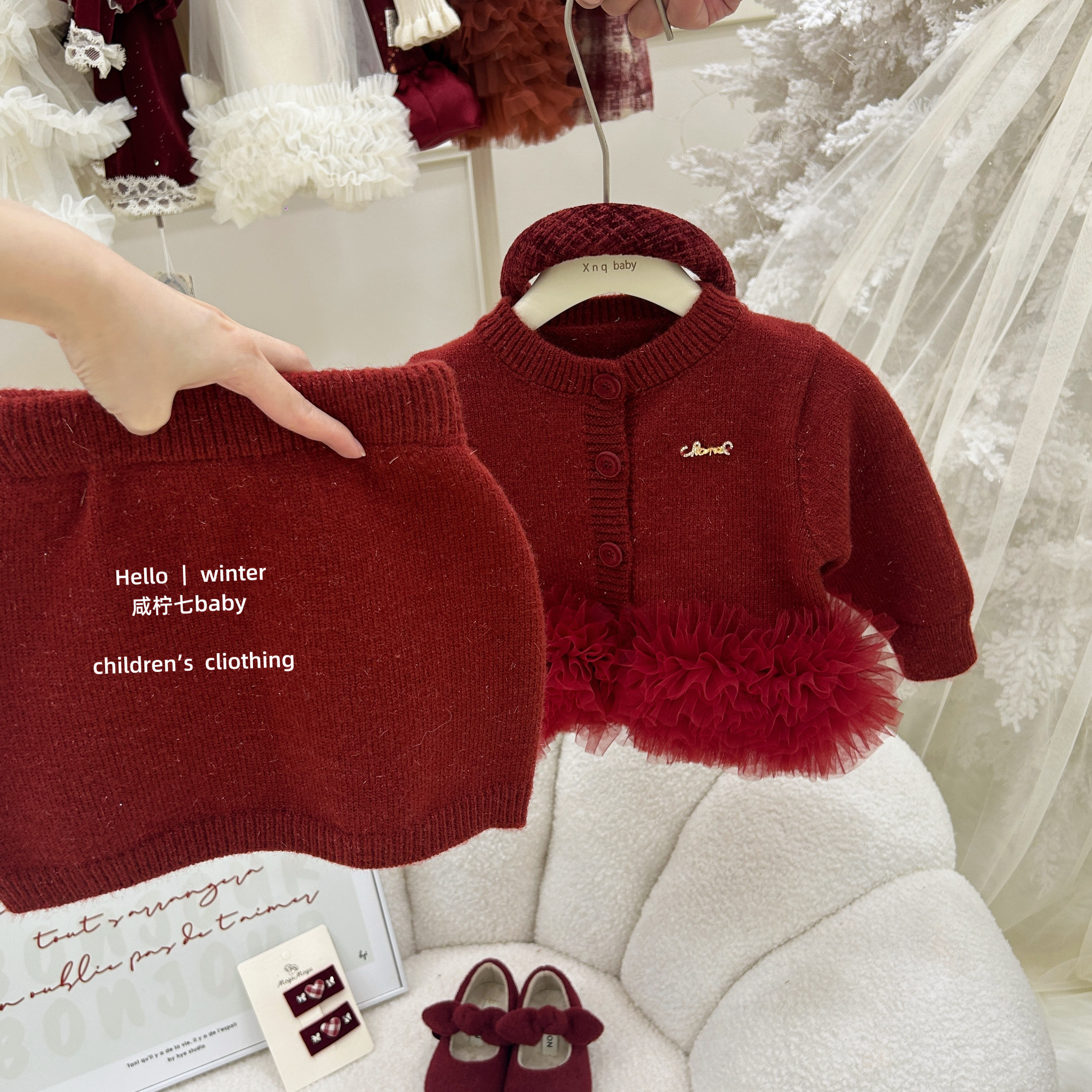 【咸柠七】原创!自留女童红色毛衣秋冬开衫针织衫半身裙新年套装