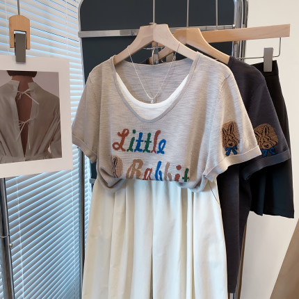 v领假两件针织衫女2025夏装新款宽松慵懒风外穿上衣薄短袖T恤衫潮