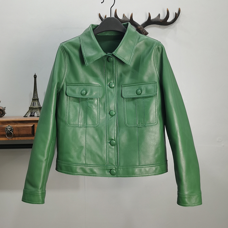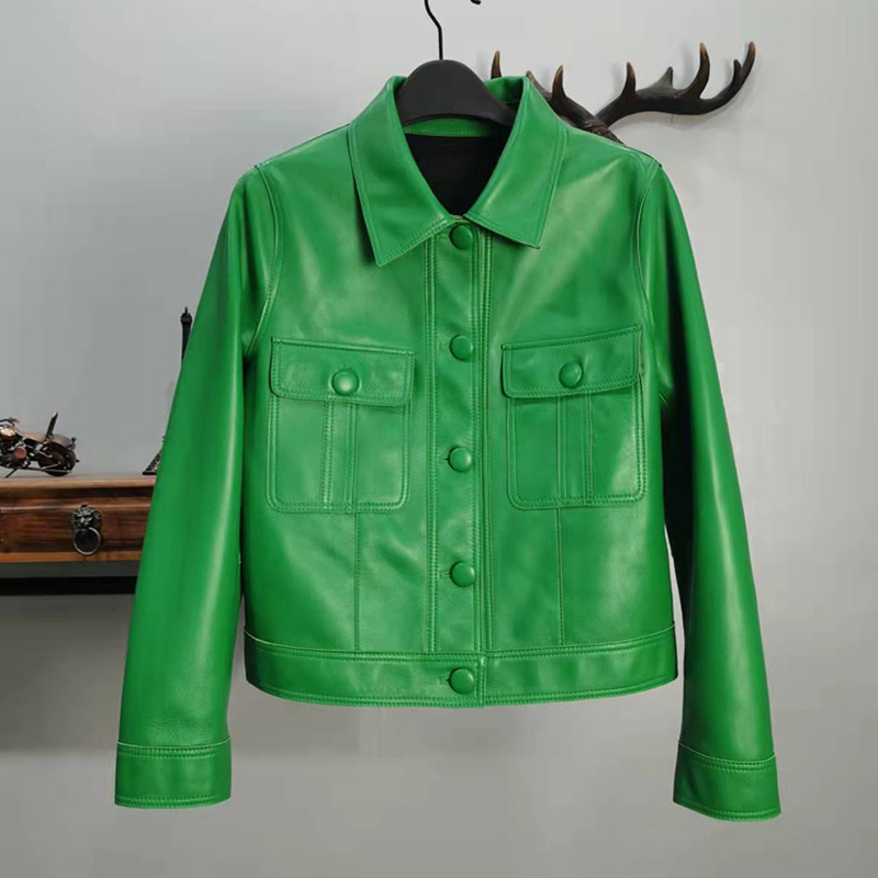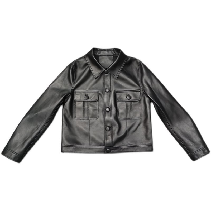 欧洲站2025秋新款真皮皮衣女绵羊皮短款方领休闲皮夹克单排扣外套