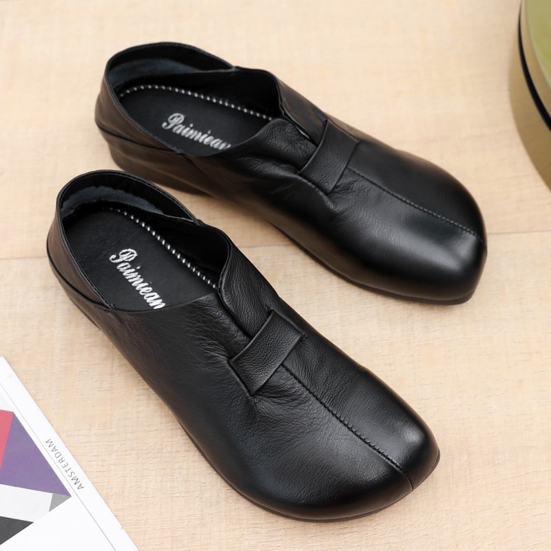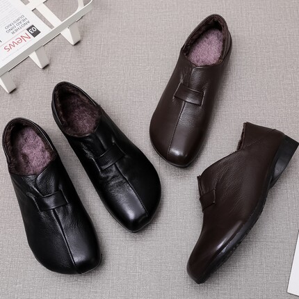 真皮加绒妈妈鞋平底单鞋冬软面软底舒适百搭中年女皮鞋老人鞋保暖