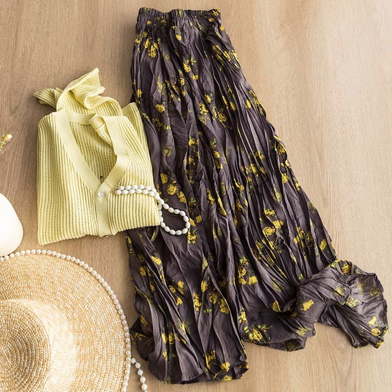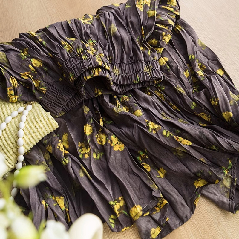 韩系复古扎染褶皱碎花a字中长裙