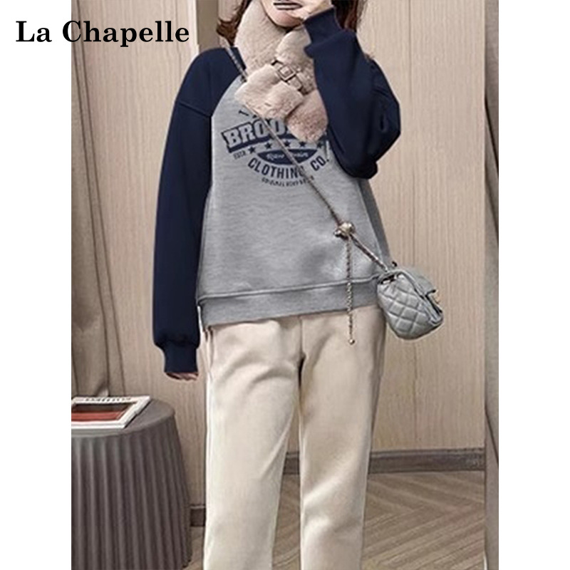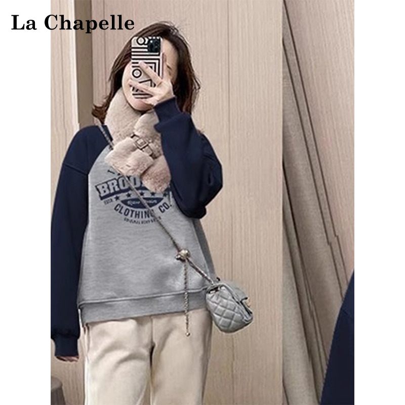 拉夏贝尔印花圆领长袖T恤女秋冬加绒加厚卫衣叠穿内搭打底衫上衣