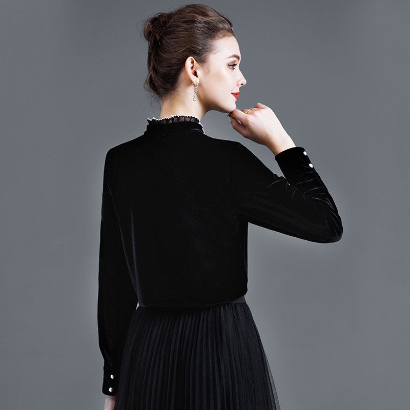 金丝绒打底衫女洋气秋冬设计感小众蕾丝上衣内搭黑色保暖衬衫女冬