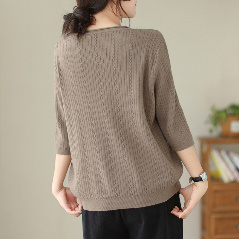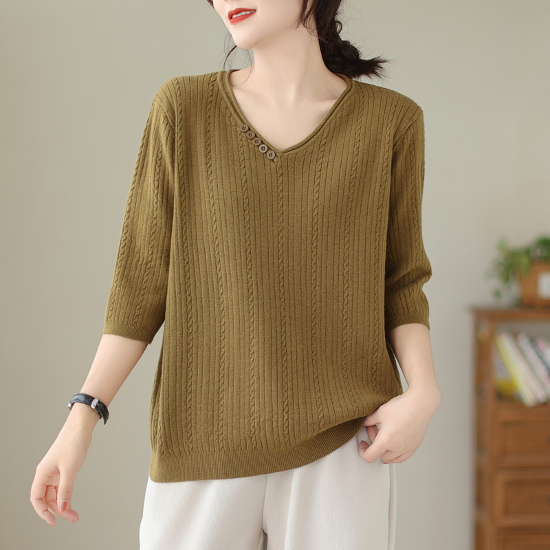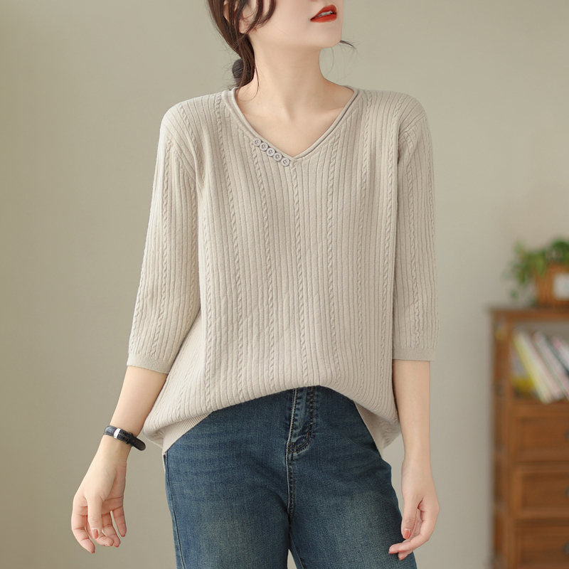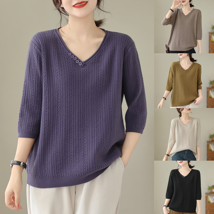 秋冬V领套头针织衫宽松大码纯色内搭7分袖上衣打底毛衣