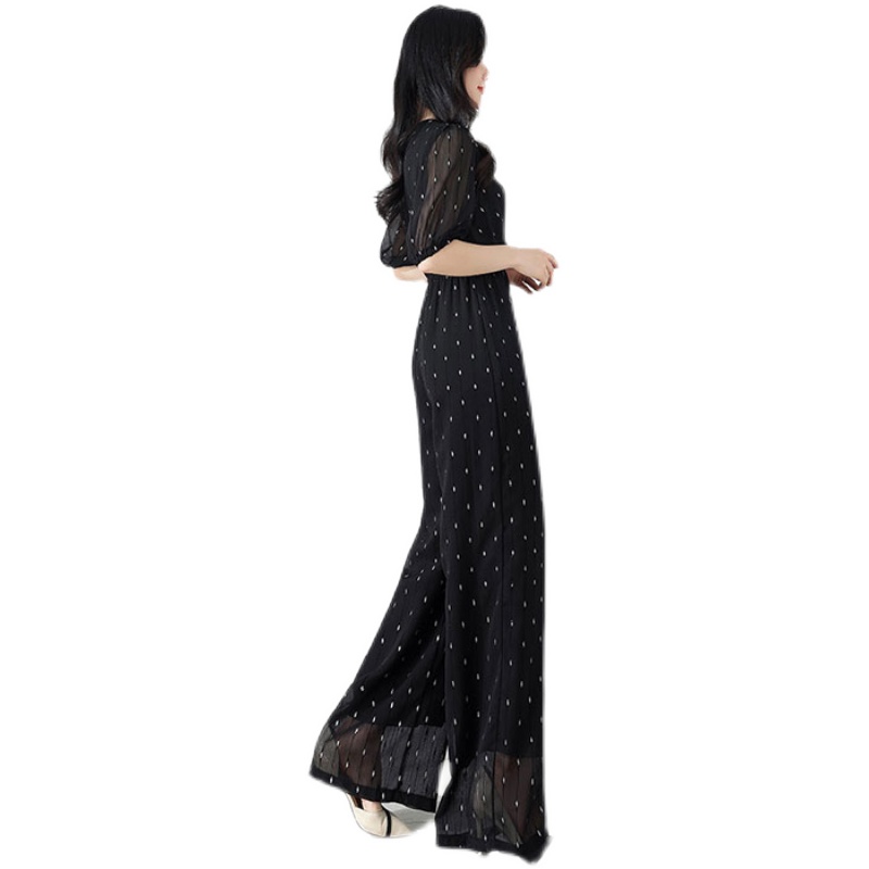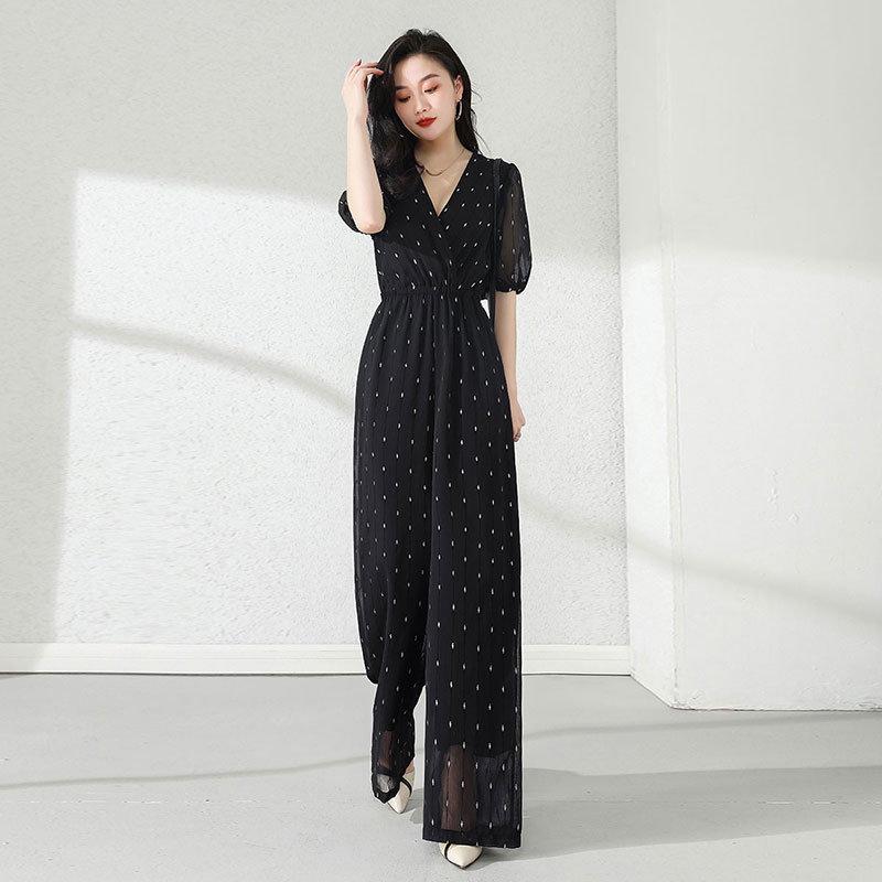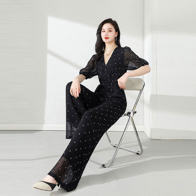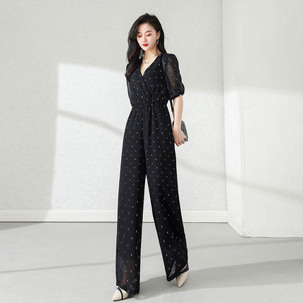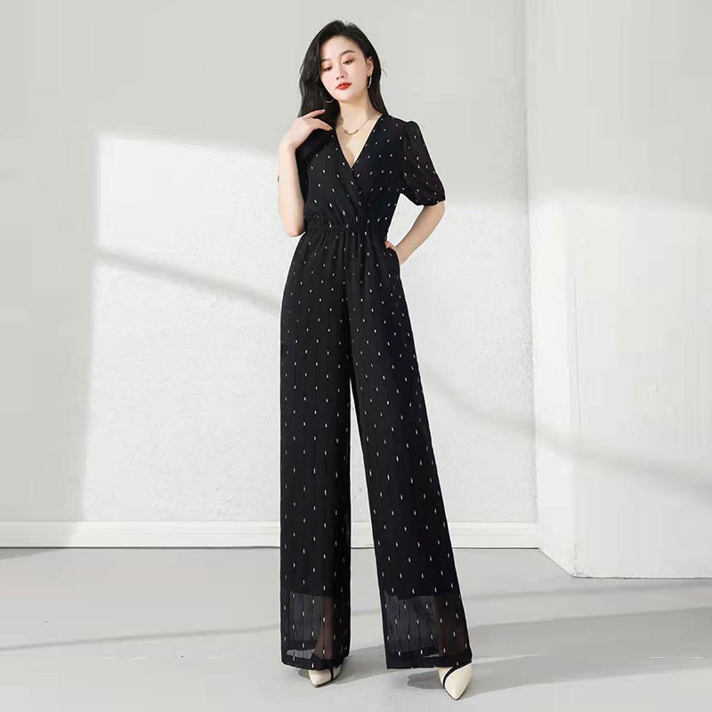 2024春夏新款连体裤高腰连体衣雪纺原创女V领显瘦修身阔腿裤长裤