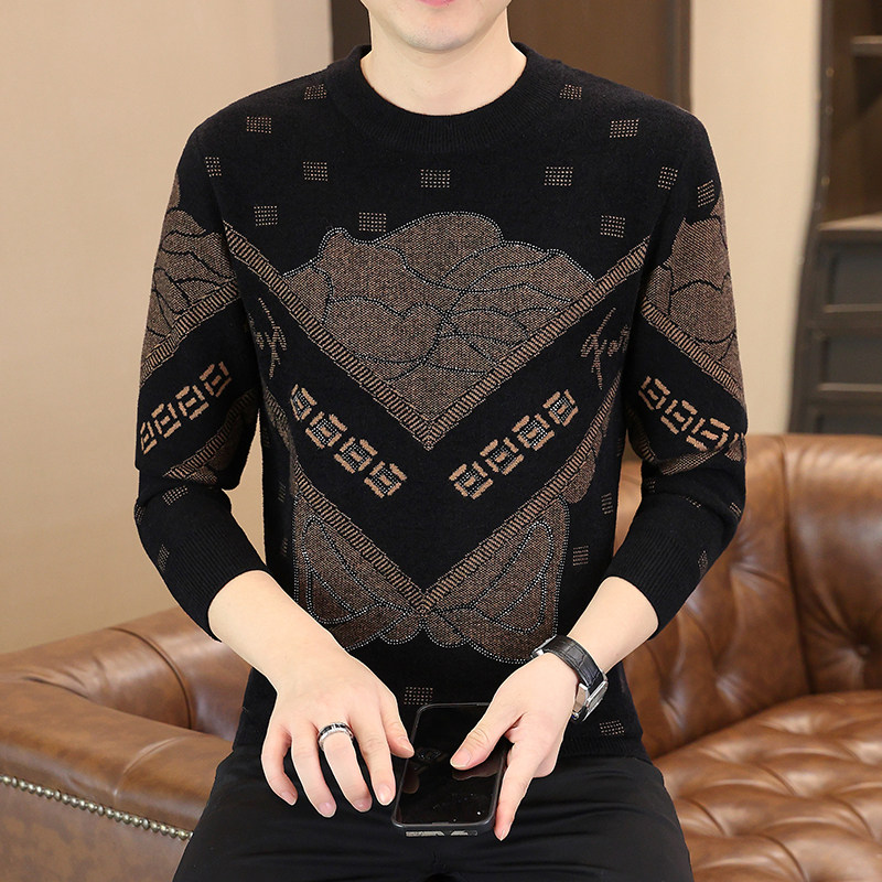 冬季加厚短绒男高档圆领针织衫毛衣欧货烫钻双面绒打底修身羊毛衫