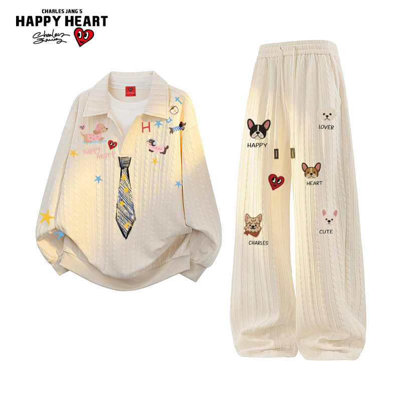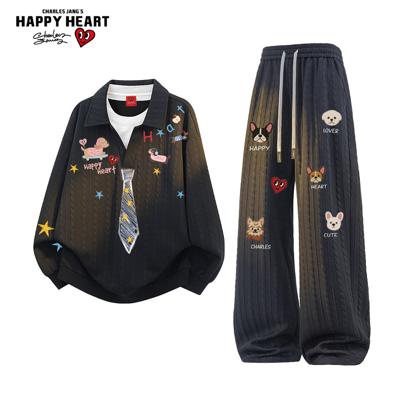 查尔斯桃心学院风领带涂鸦卫衣套装男秋季宽松休闲情侣休闲长裤子