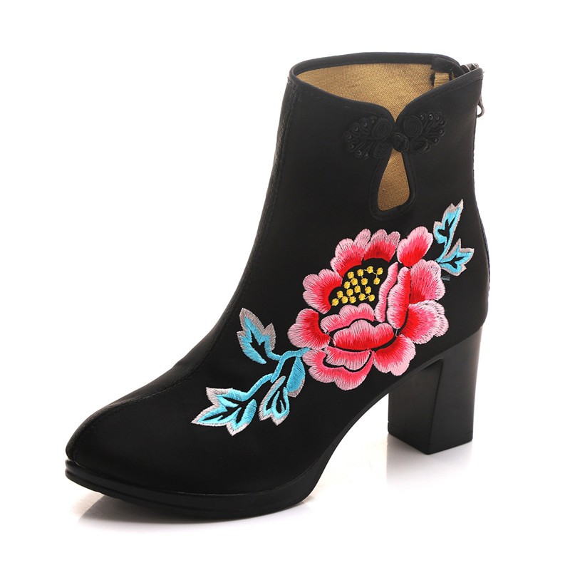 2021春秋新款短靴百搭时尚民族风女鞋绣花单靴子粗跟中高跟马丁靴