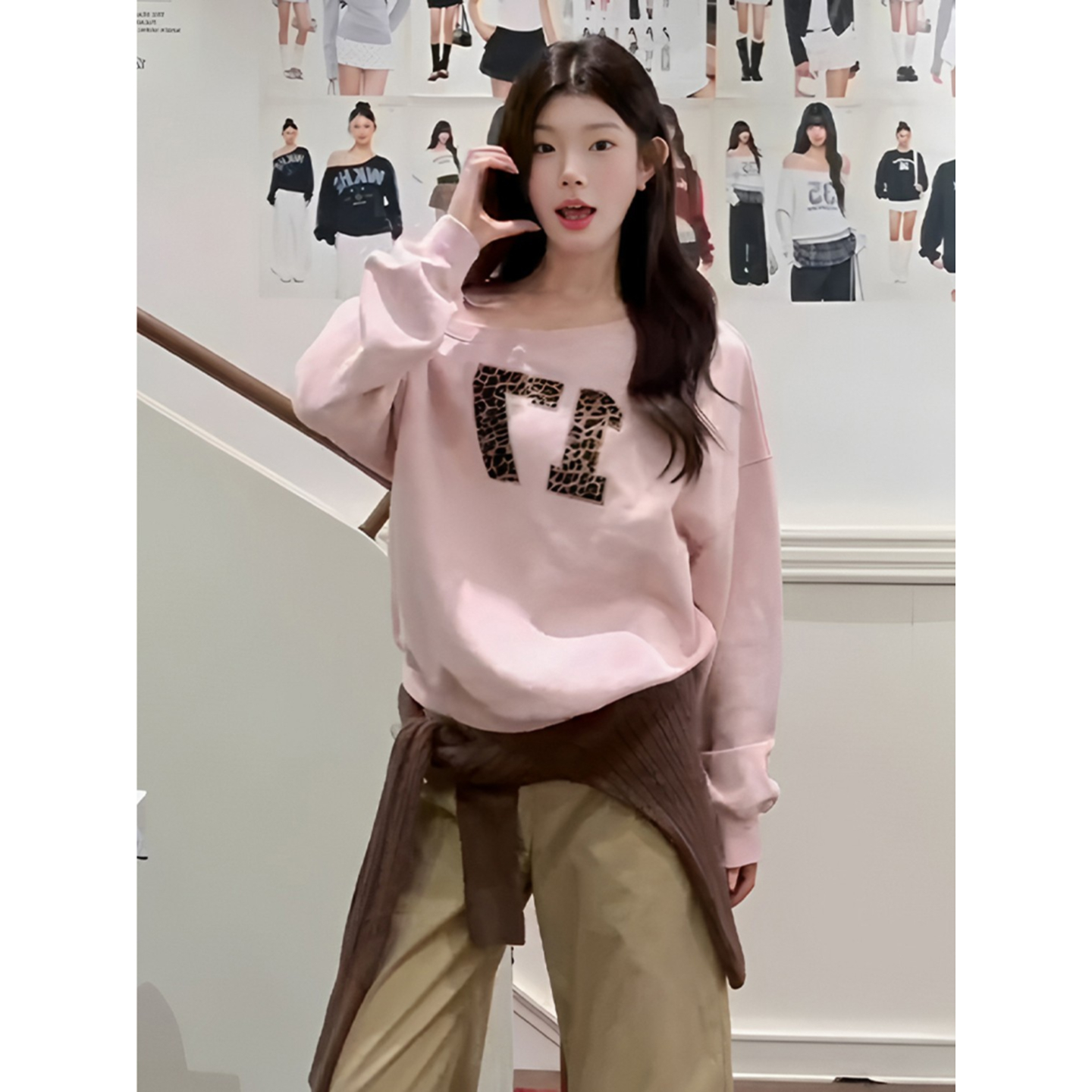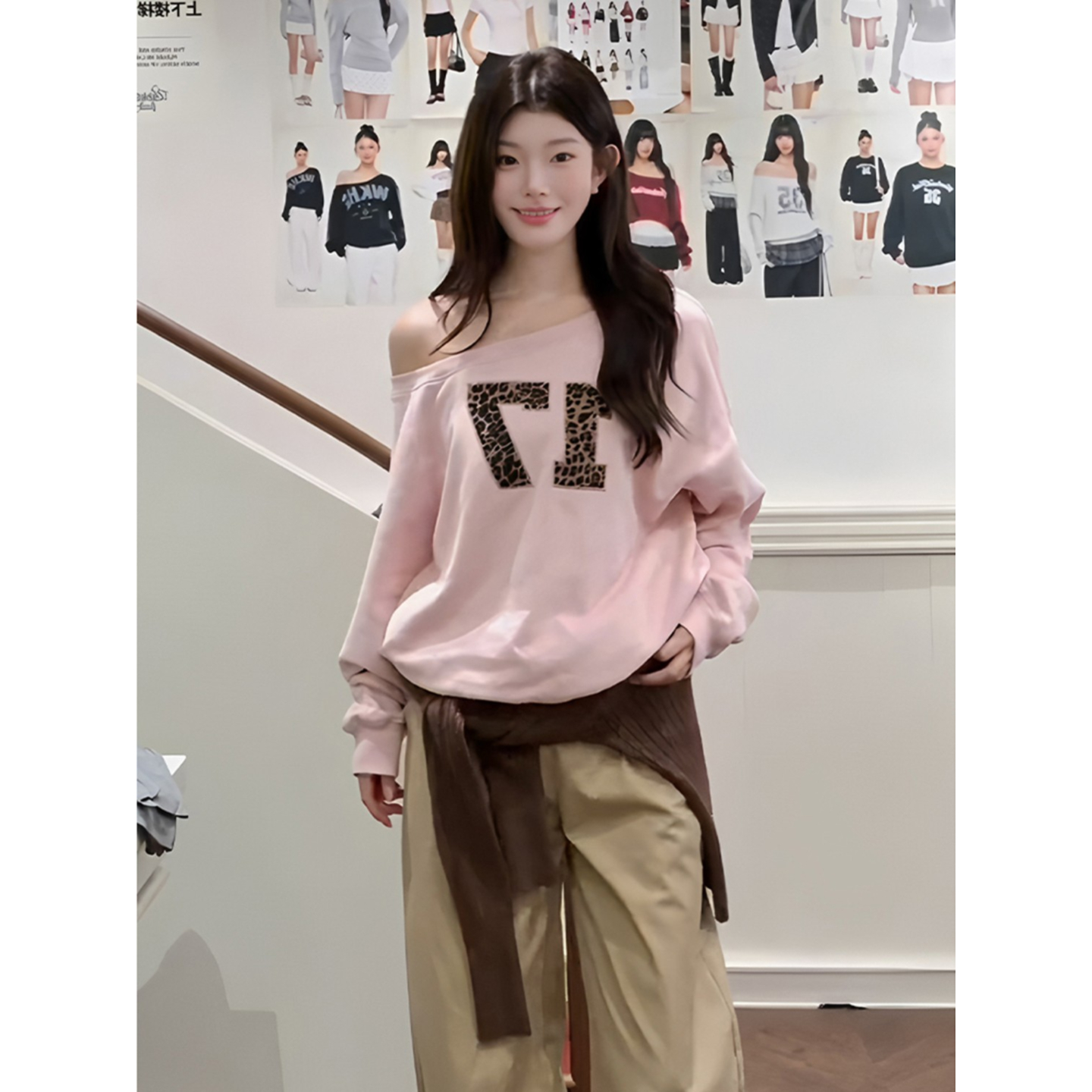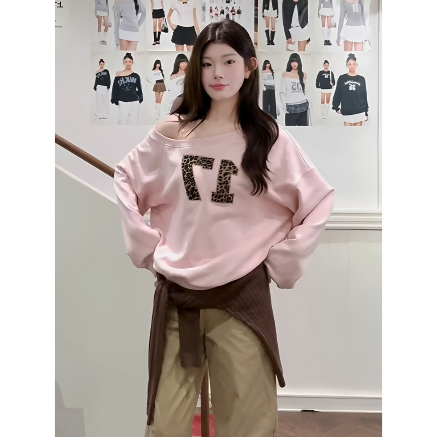 大码胖mm美式复古粉色斜露肩卫衣女秋季数字豹纹宽松显瘦辣妹上衣