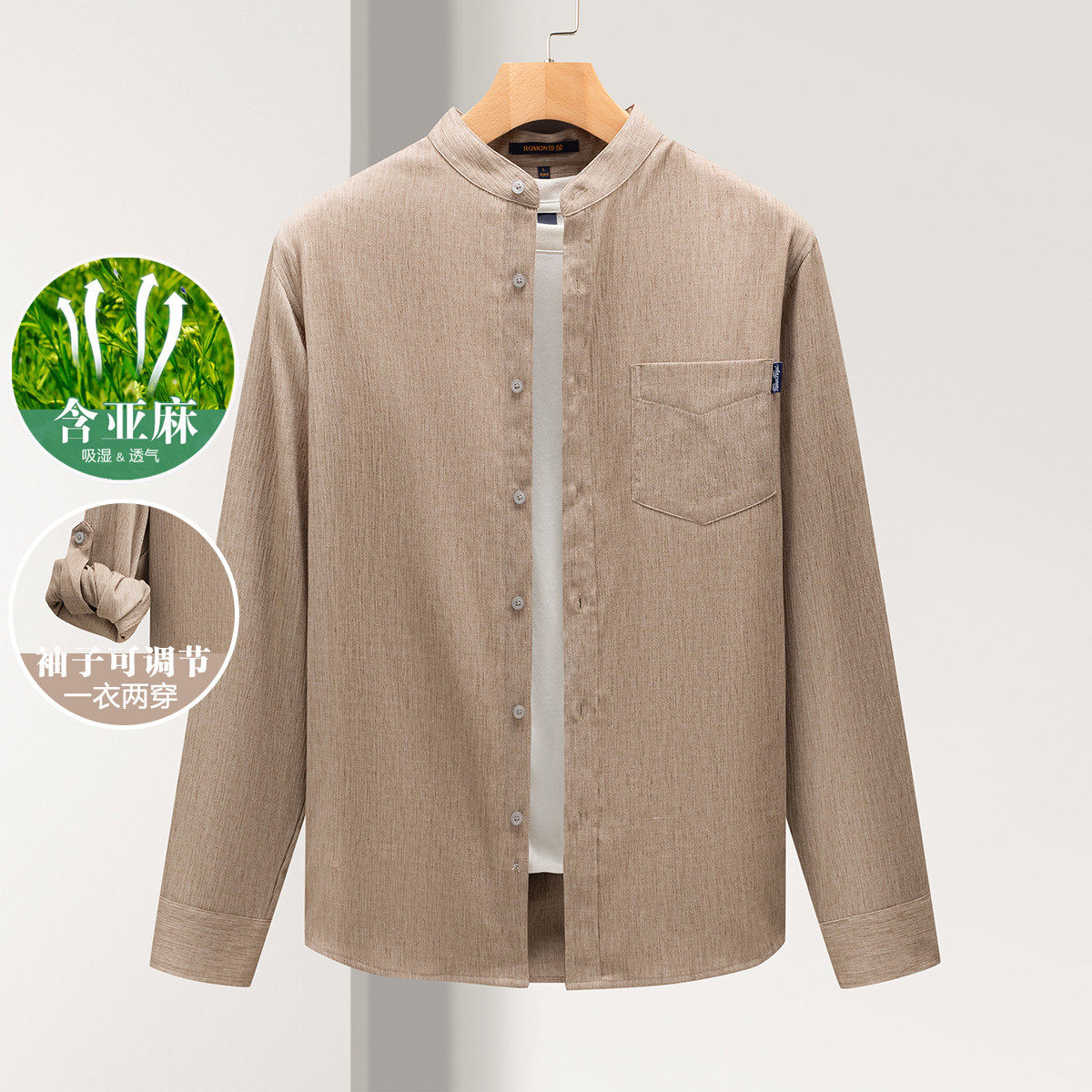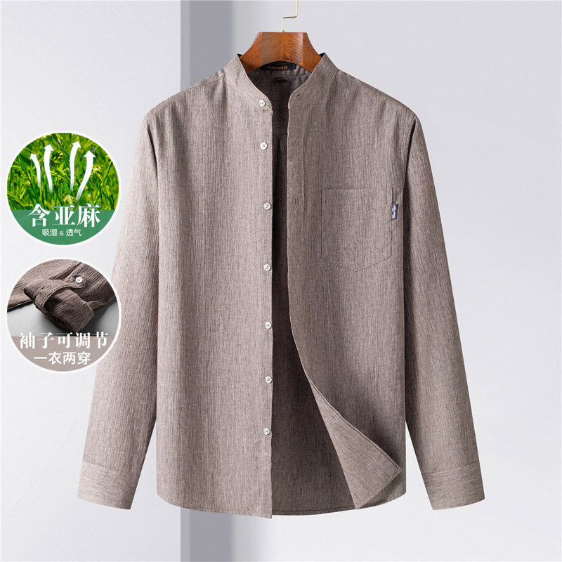 罗蒙一衣两穿亚麻棉长袖衬衫短袖可调节男士速干立领休闲口袋衬衣