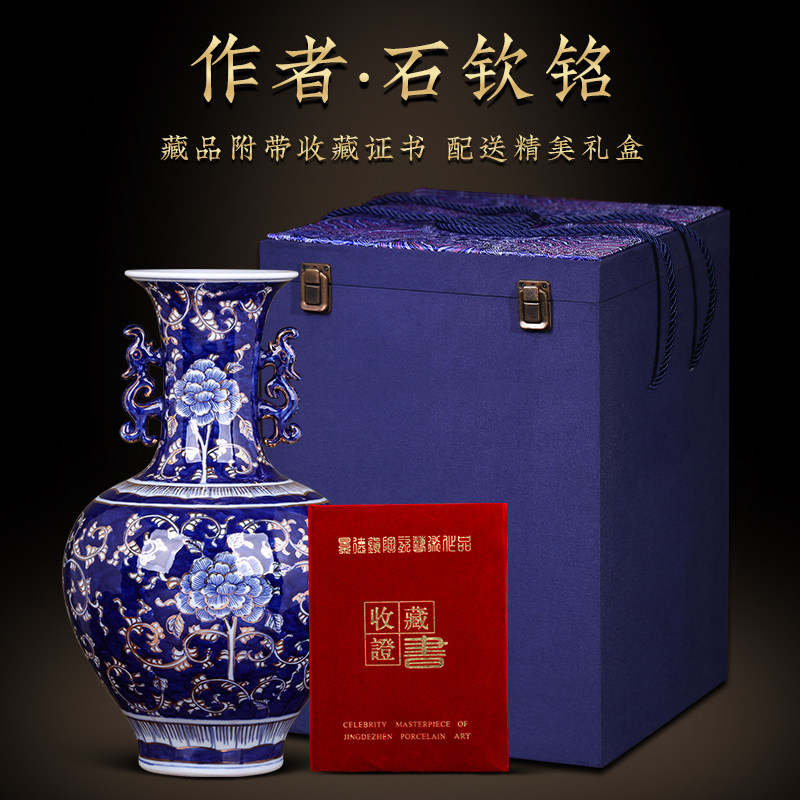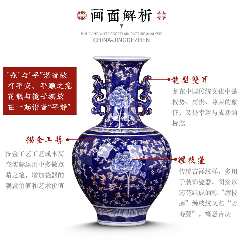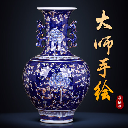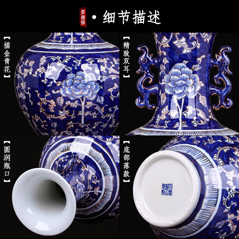 景德镇陶瓷器花瓶客厅大号手绘描金新中式青花瓷电视柜摆件高级感
