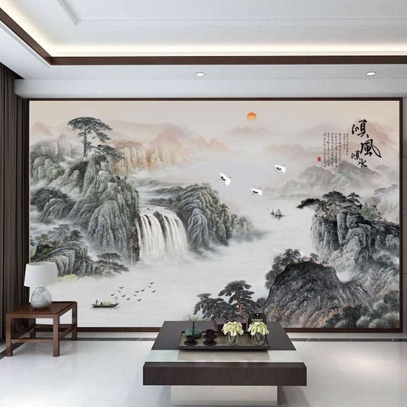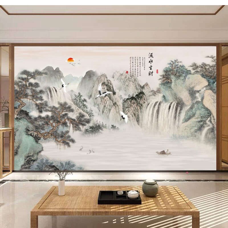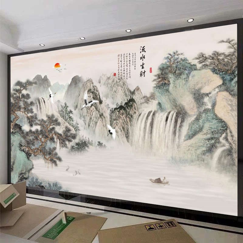 新中式壁画电视背景墙壁纸客厅沙发墙山水墙布迎客松墙纸流水生财