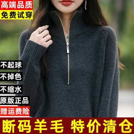 半开领100羊毛衫女宽松拉链纯色百搭短款毛衣秋冬羊绒针织打底衫