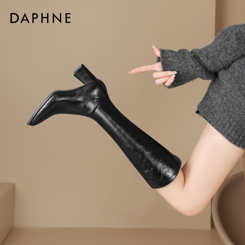 达芙妮高跟鞋女长筒靴2025新款冬季黑色尖头V口靴子秋冬高筒粗跟