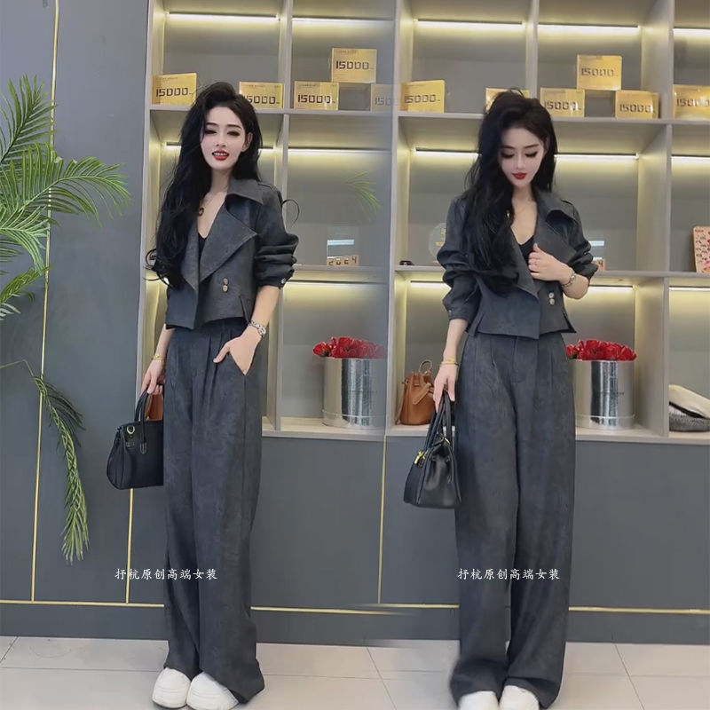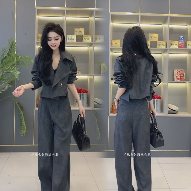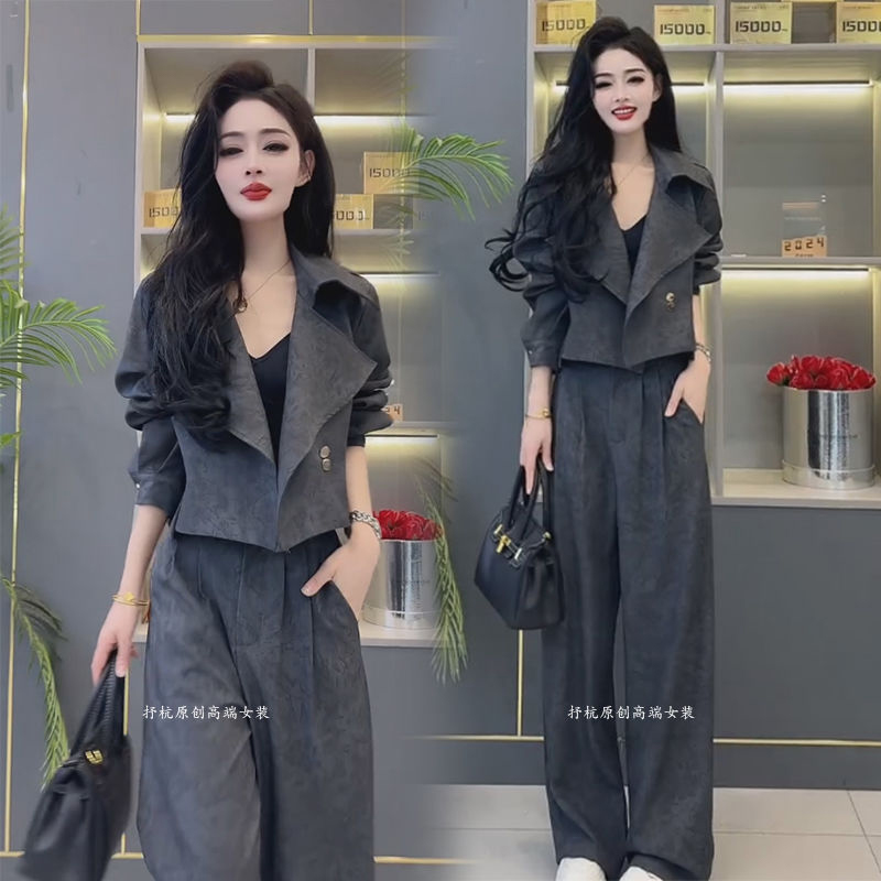 时尚套装女2025春季新款欧货洋气高级感短款西装外套阔腿裤两件套
