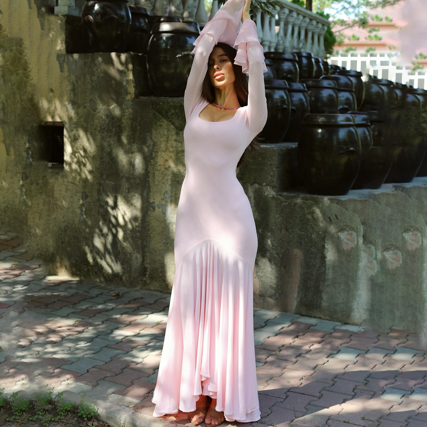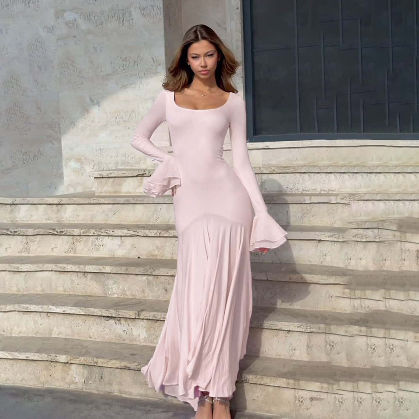 AOMR法式纯欲喇叭袖针织连衣裙女度假风网纱飘逸修身显瘦鱼尾长裙