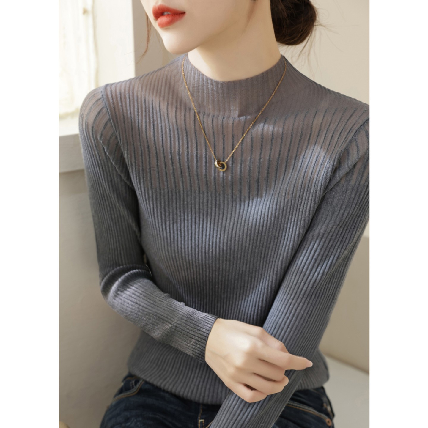 半高领蕾丝网纱针织打底衫女秋冬2025新款修身毛衣长袖巨好看上衣