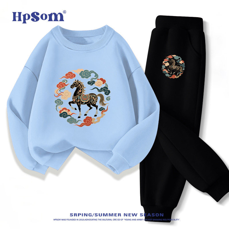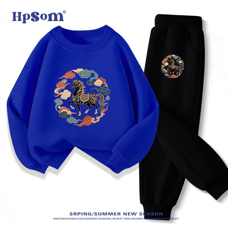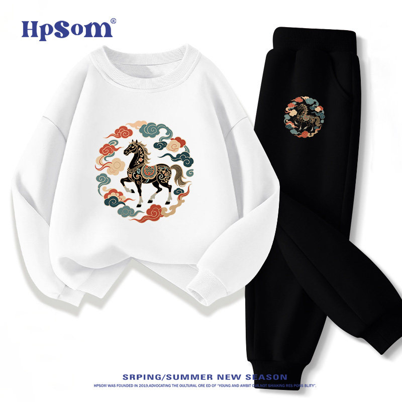 红色儿童圆领卫衣套装马年2026新款秋冬季男女孩中大童加绒本命年
