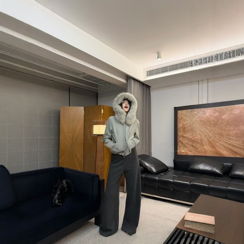 R13真貉子毛领加绒连帽卫衣外套