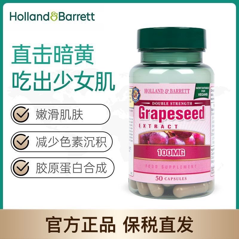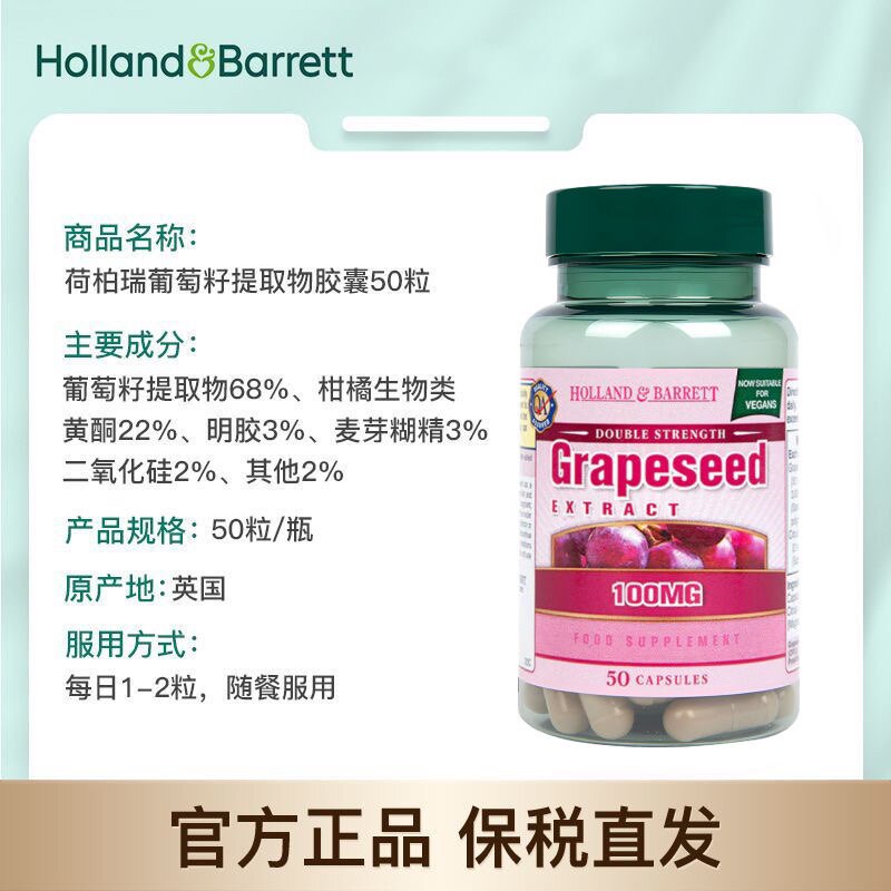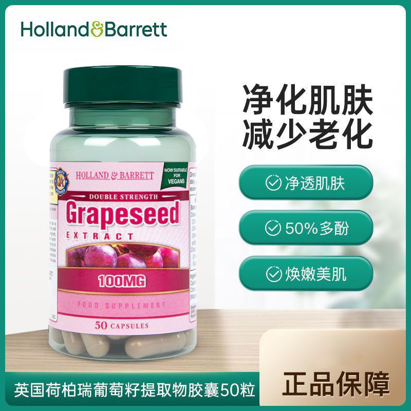 保税仓 英国Holland&Barrett荷柏瑞葡萄籽精华100mg50粒原花青素