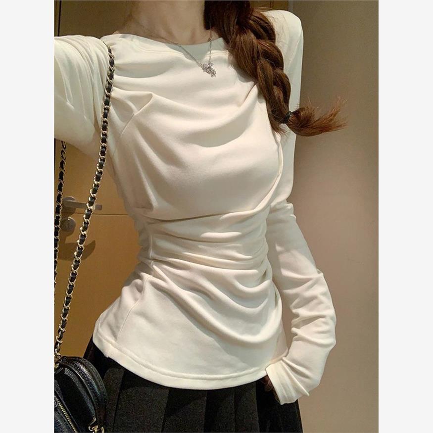 白色正肩圆领长袖内搭T恤女春秋2025修身抽褶紧身miu系打底衫上衣