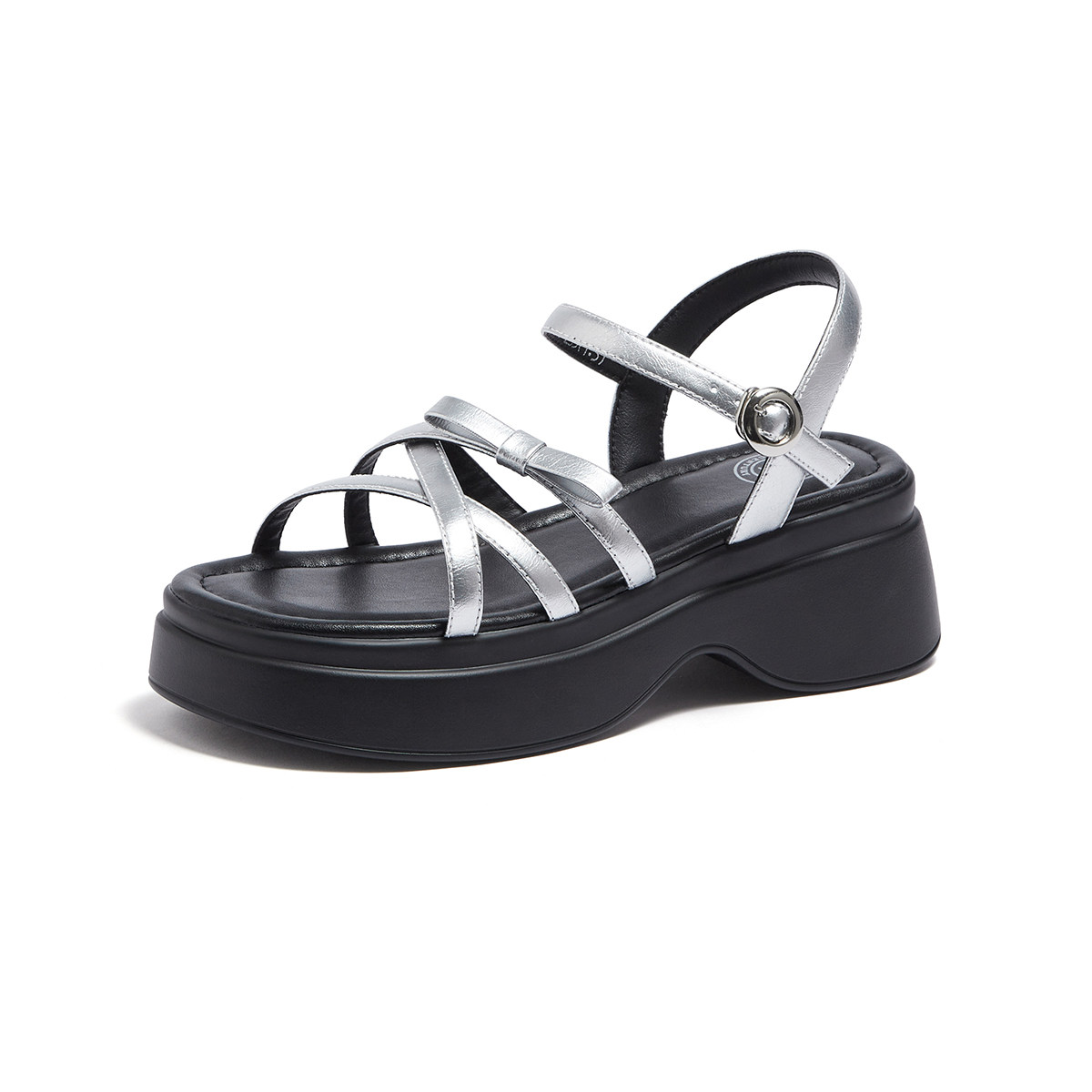 骆驼女鞋2025夏季厚底增高凉鞋复古银色通勤度假时装休闲凉鞋