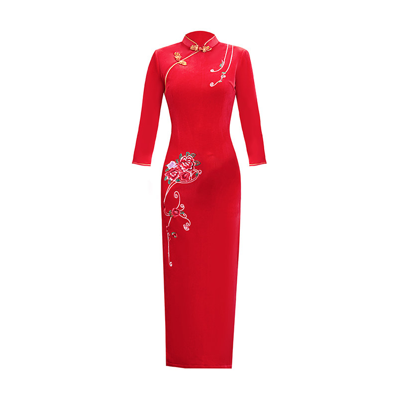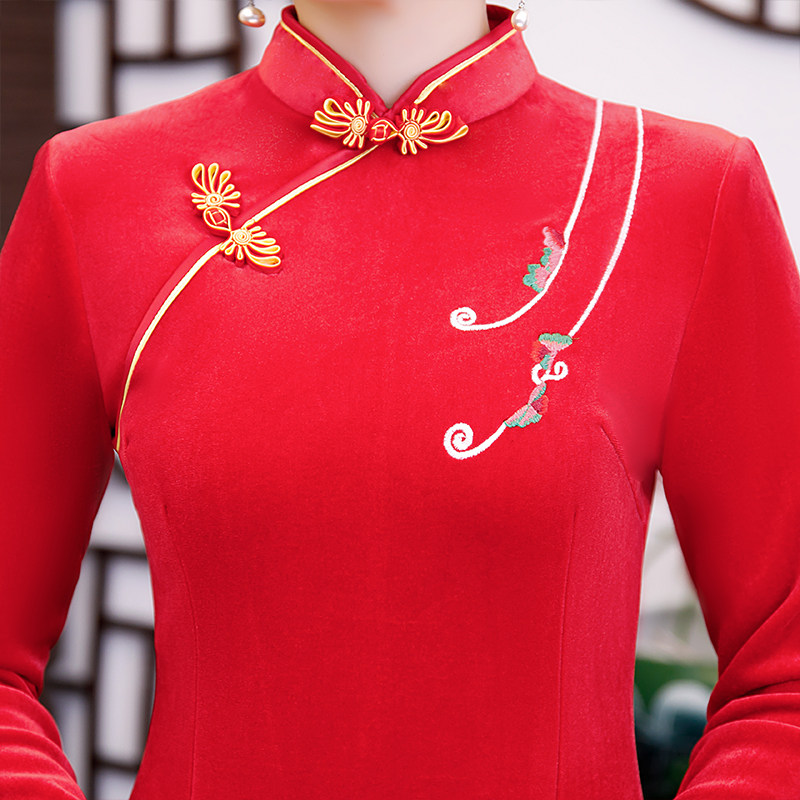 旗袍加绒加厚长袖妈妈喜庆绣花