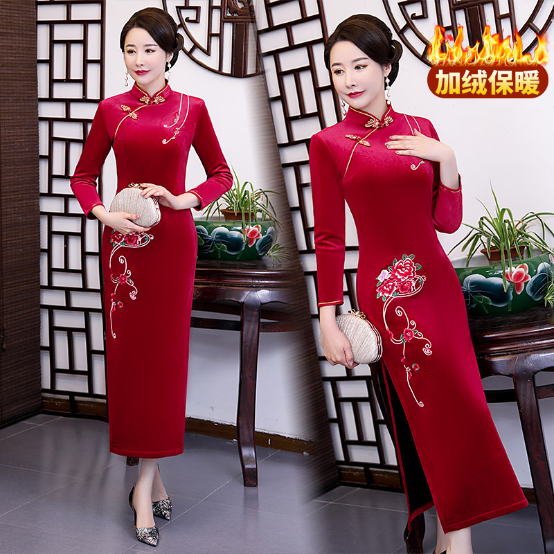 秋冬加绒加厚旗袍女金丝绒长袖改良妈妈喜庆婚礼服长款绣花连衣裙
