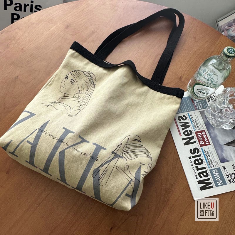 原创设计欧式插画文艺慵懒风ins手拎单肩包环保购物袋帆布书包女