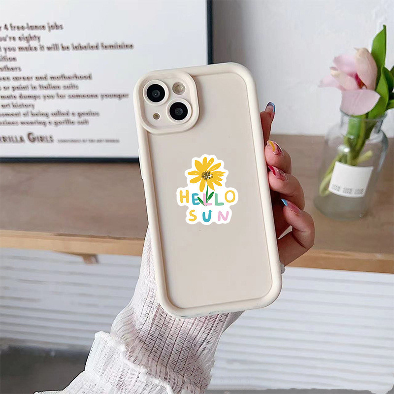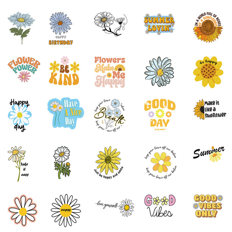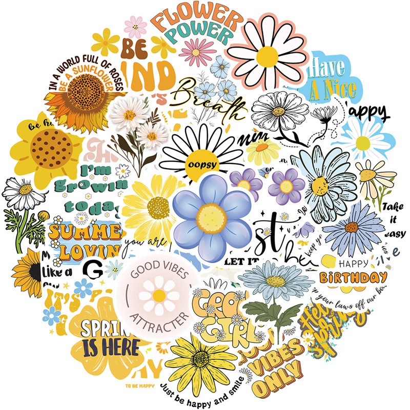 50张小清新雏菊文字贴纸黄色花朵向日葵励志贴画装饰笔记手机相框手账保温杯电动车滑板电脑冰箱DIY防水贴纸