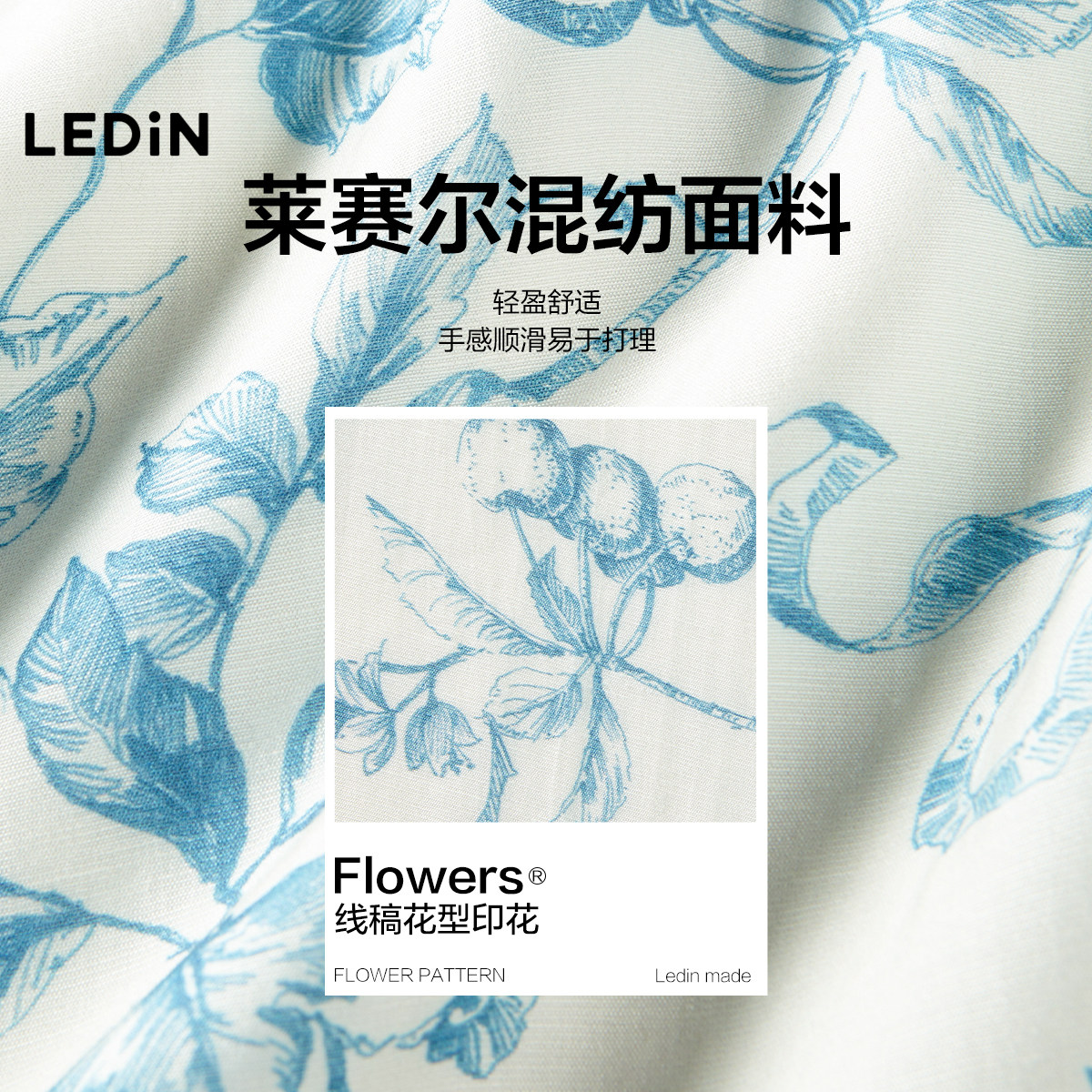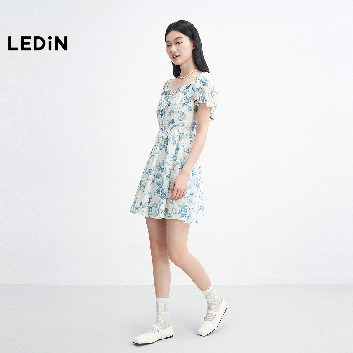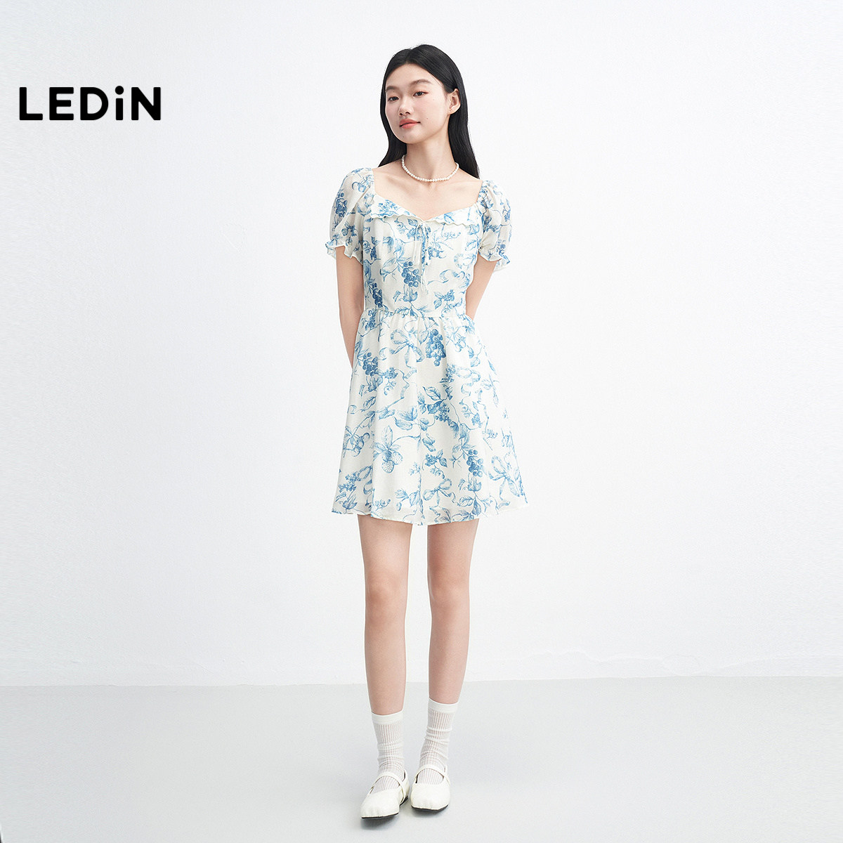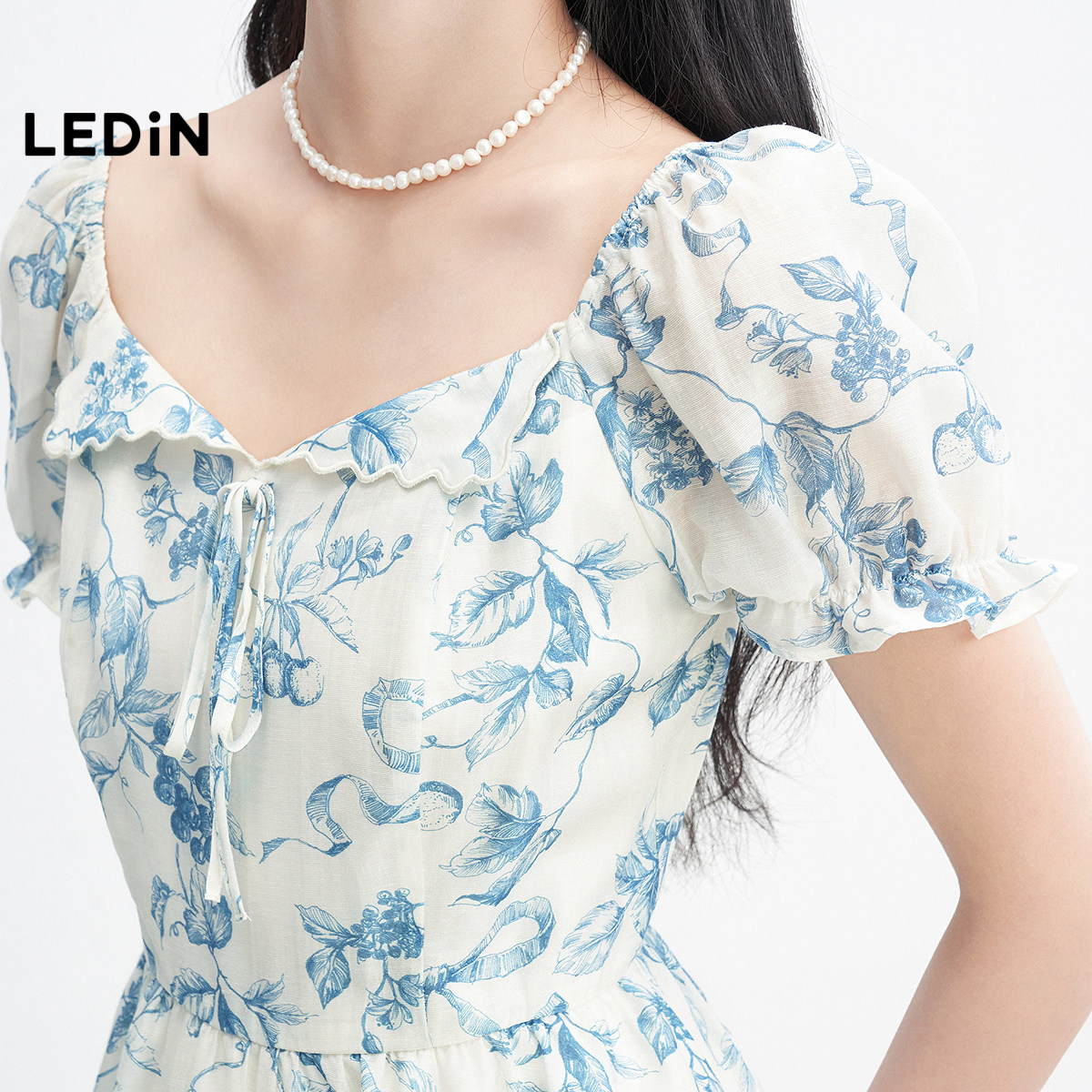 乐町插画师图案刺绣波浪边翻领连衣裙女2025年夏季新款泡泡袖裙子