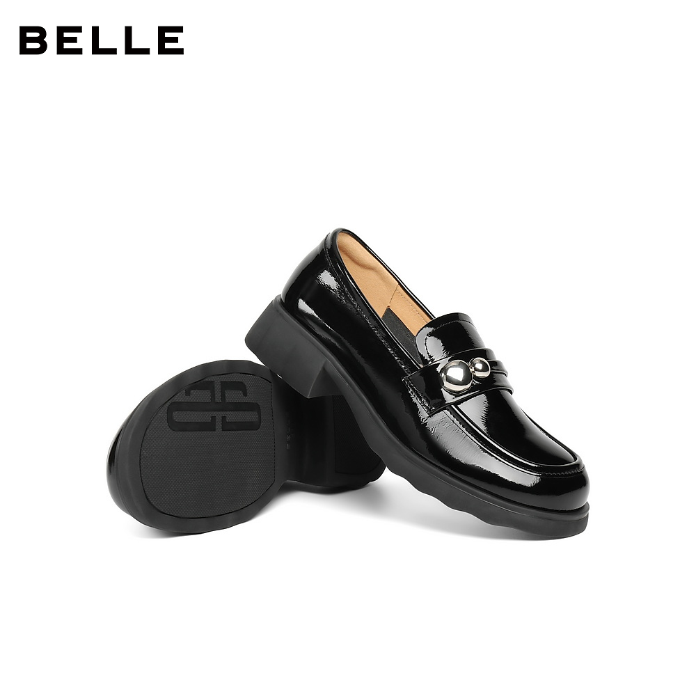 百丽厚底复古乐福鞋女2025秋季新款黑色小皮鞋深口单鞋子E1G1DCA5