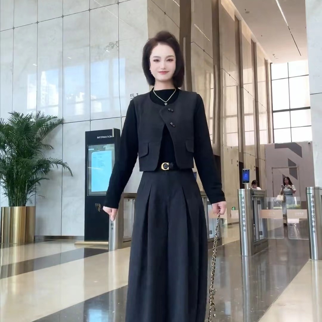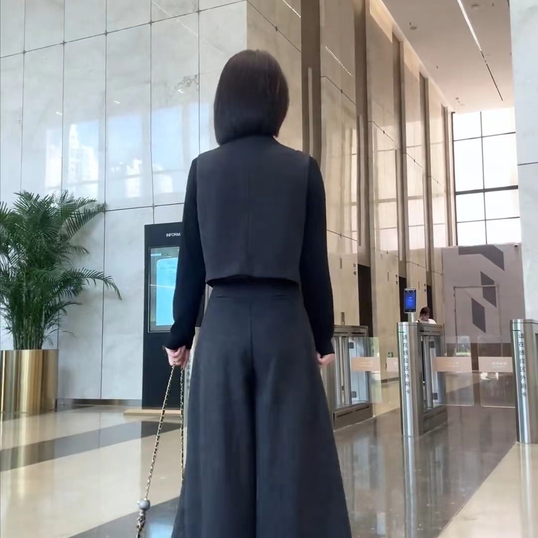 蔡小姐2025秋冬新款女气质显瘦复古毛呢时尚马甲+打底+裤裙套装