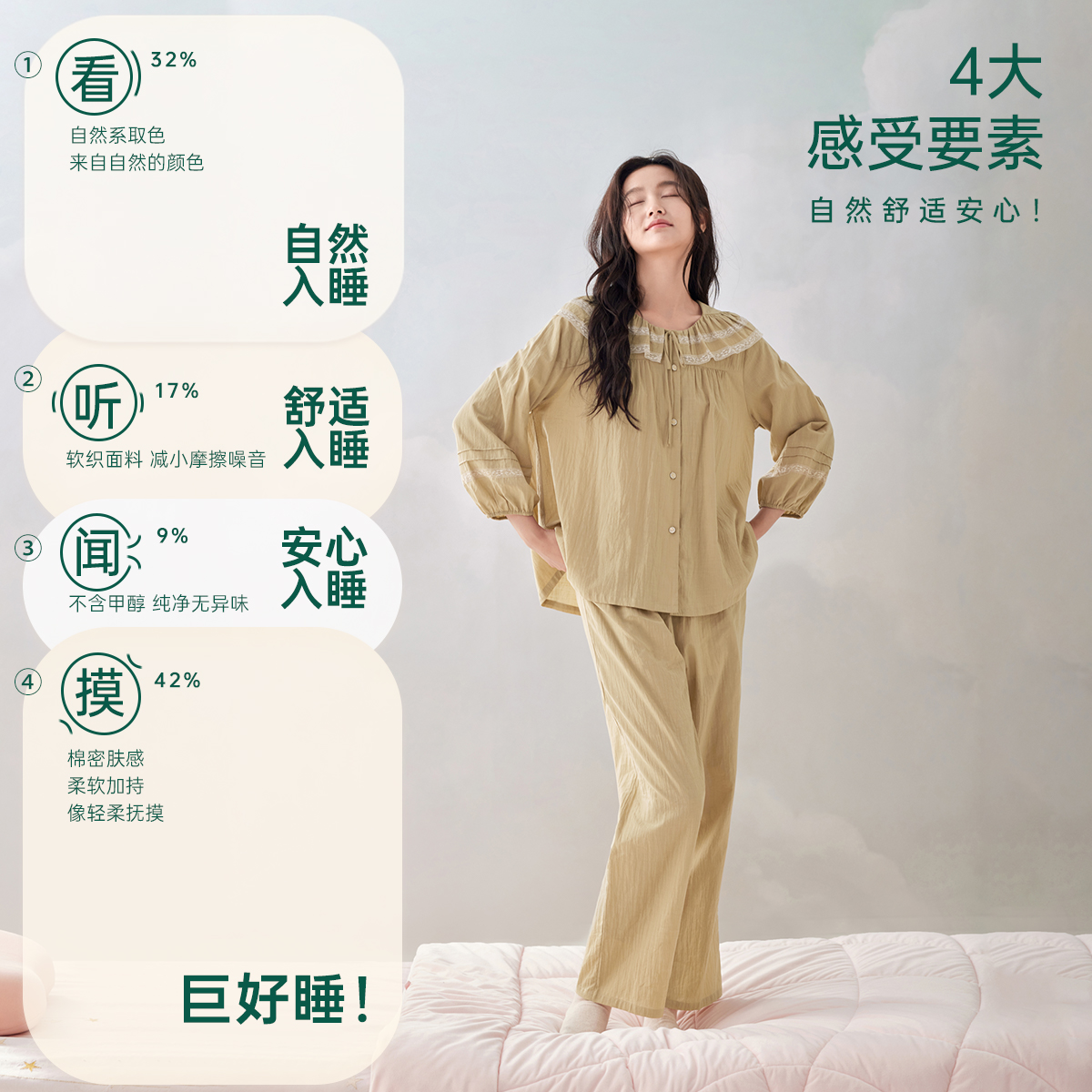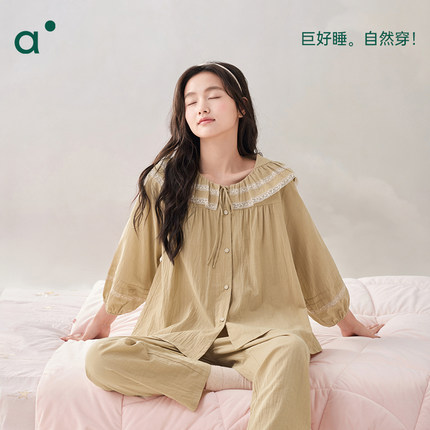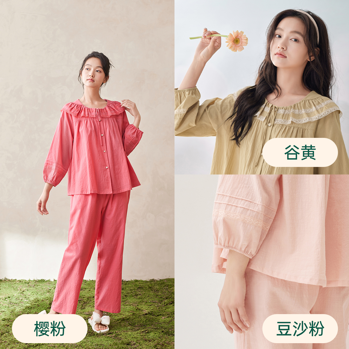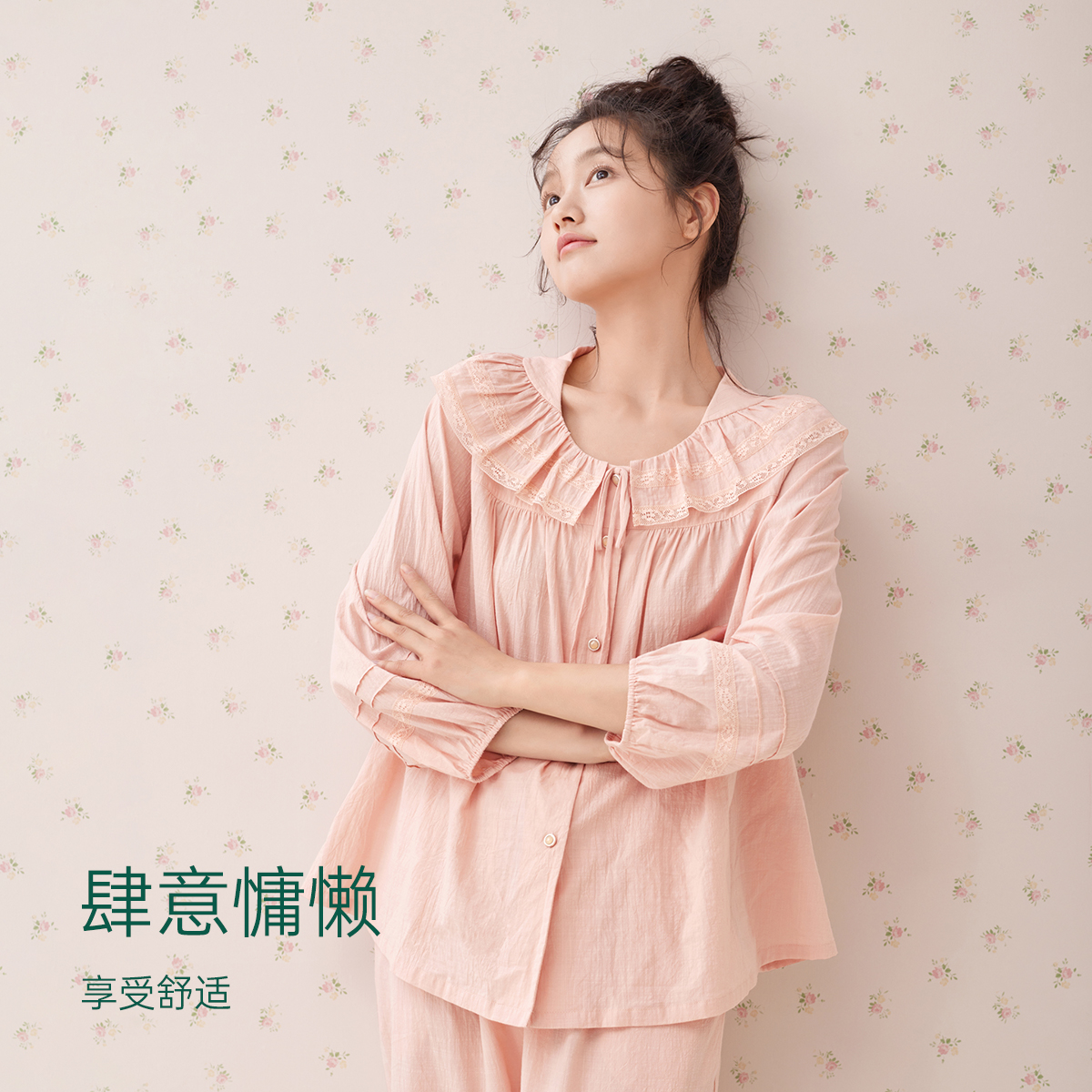 安之伴春秋梭织甜美睡衣女新款纯棉长袖娃娃领薄款休闲宽松家居服
