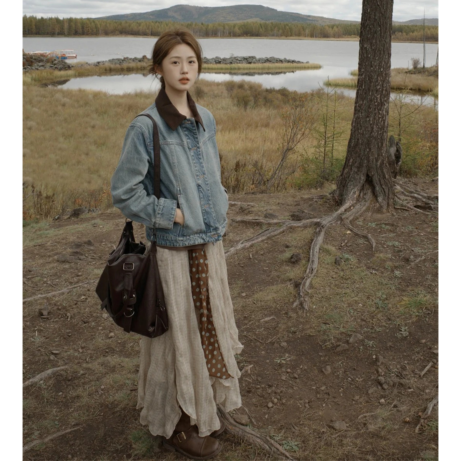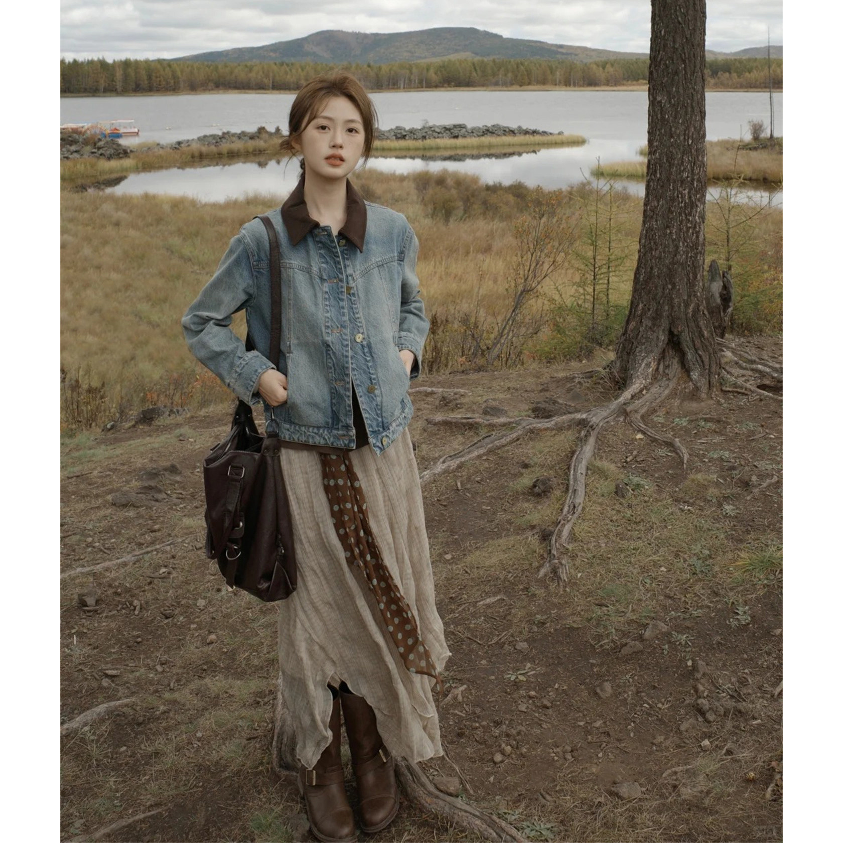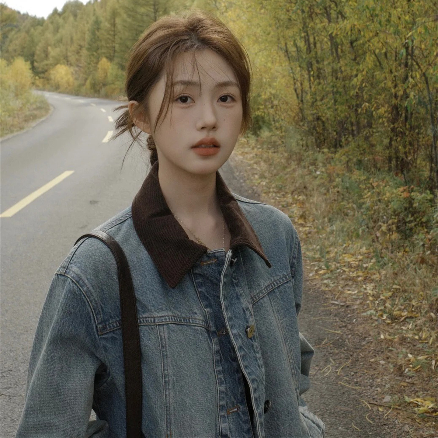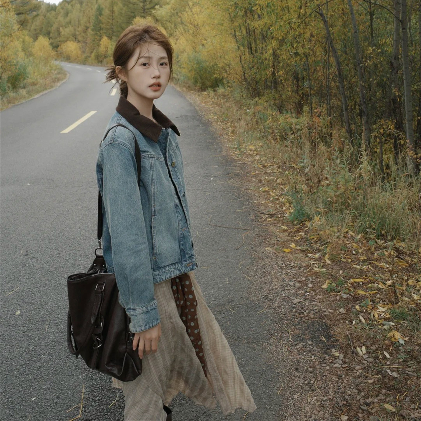 萱琪XUANQI港风复古短款牛仔外套女春秋季拼接灯芯绒翻领夹克上衣