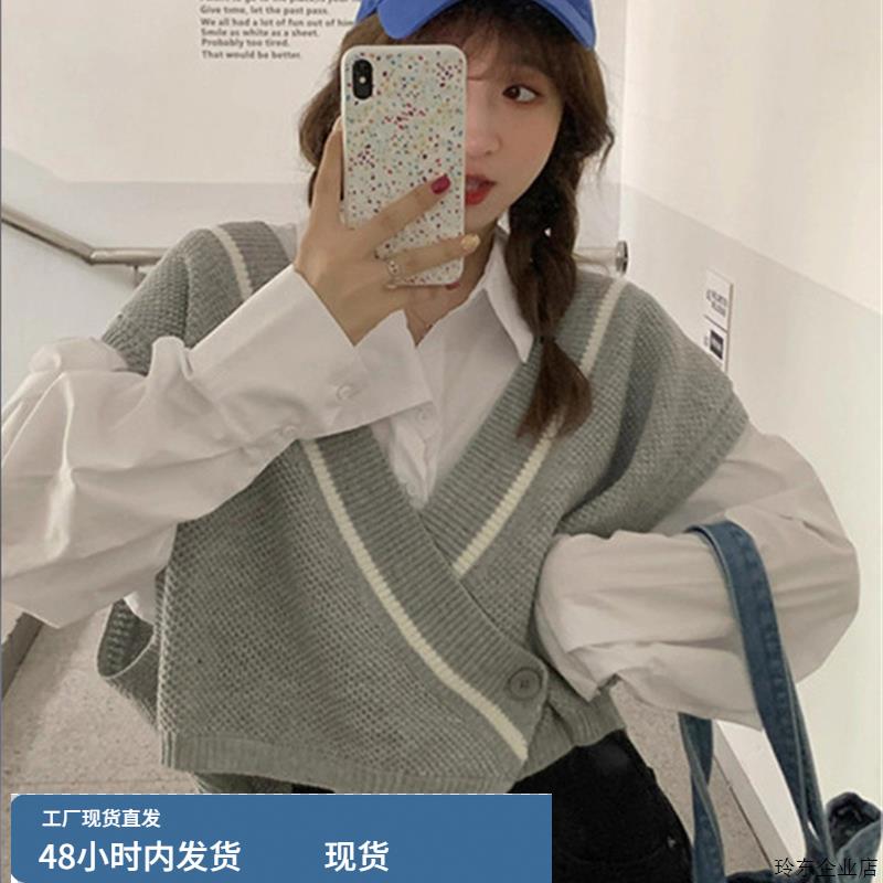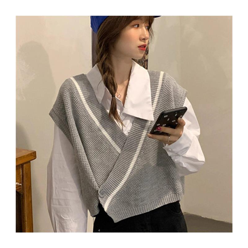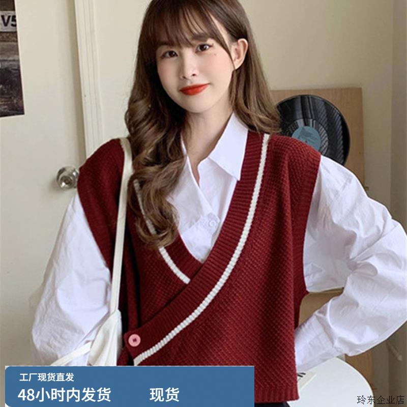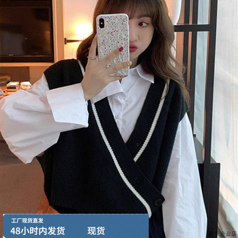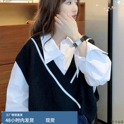衬衫背心套装女子春秋季欧洲黑色V领针织背心背心分层白衬衫两件